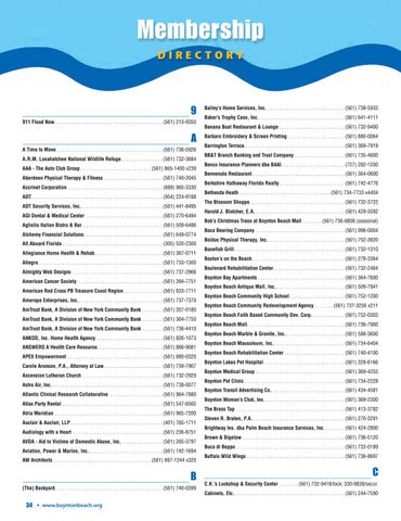 A Time to Move . . . . . . . . . . . . . . . . . . . . . . . . . . . . . . . . . . . . . . . . (561) 736-5926 A.R.M. Loxahatchee National Wildlife Refuge. . . . . . . . . . . . . . . . (561) 732-3684 AAA - The Auto Club Group . . . . . . . . . . . . . . . . . . . . . . . . . . . (561) 865-1400 x239 Aberdeen Physical Therapy & Fitness . . . . . . . . . . . . . . . . . . . . . . (561) 740-2045 Accrinet Corporation . . . . . . . . . . . . . . . . . . . . . . . . . . . . . . . . . . . . (888) 965-3330 ADT. . . . . . . . . . . . . . . . . . . . . . . . . . . . . . . . . . . . . . . . . . . . . . . . . . (954) 224-9188 ADT Security Services, Inc.. . . . . . . . . . . . . . . . . . . . . . . . . . . . . . . (561) 441-8495 AGI Dental & Medical Center . . . . . . . . . . . . . . . . . . . . . . . . . . . . . (561) 270-6494 Agliolio Italian Bistro & Bar . . . . . . . . . . . . . . . . . . . . . . . . . . . . . . (561) 509-6486 Alchemy Financial Solutions. . . . . . . . . . . . . . . . . . . . . . . . . . . . . . (561) 649-0774 All Aboard Florida . . . . . . . . . . . . . . . . . . . . . . . . . . . . . . . . . . . . . . (305) 520-2300 Allegiance Home Health & Rehab. . . . . . . . . . . . . . . . . . . . . . . . . . (561) 367-0711 Allegro . . . . . . . . . . . . . . . . . . . . . . . . . . . . . . . . . . . . . . . . . . . . . . . (561) 733-1300 Almighty Web Designs . . . . . . . . . . . . . . . . . . . . . . . . . . . . . . . . . . (561) 737-2866 American Cancer Society . . . . . . . . . . . . . . . . . . . . . . . . . . . . . . . . (561) 394-7751 American Red Cross PB Treasure Coast Region . . . . . . . . . . . . . . . (561) 833-7711 Amerope Enterprises, Inc.. . . . . . . . . . . . . . . . . . . . . . . . . . . . . . . . (561) 737-7370 AmTrust Bank, A Division of New York Community Bank . . . . . . . . (561) 357-0180 AmTrust Bank, A Division of New York Community Bank . . . . . . . . (561) 364-7750 AmTrust Bank, A Division of New York Community Bank . . . . . . . . (561) 736-4410 ANKOD, Inc. Home Health Agency . . . . . . . . . . . . . . . . . . . . . . . . . (561) 826-1073 ANSWERS A Health Care Resource. . . . . . . . . . . . . . . . . . . . . . . . . (561) 866-9081 APEX Empowerment . . . . . . . . . . . . . . . . . . . . . . . . . . . . . . . . . . . . (561) 880-0320 Carole Aronson, P.A., Attorney at Law . . . . . . . . . . . . . . . . . . . . . . (561) 739-7907 Ascension Lutheran Church. . . . . . . . . . . . . . . . . . . . . . . . . . . . . . . (561) 732-2929 Astro Air, Inc. . . . . . . . . . . . . . . . . . . . . . . . . . . . . . . . . . . . . . . . . . . (561) 738-0077 Atlantic Clinical Research Collaborative . . . . . . . . . . . . . . . . . . . . (561) 964-7880 Atlas Party Rental . . . . . . . . . . . . . . . . . . . . . . . . . . . . . . . . . . . . . . (561) 547-6565 Atria Meridian . . . . . . . . . . . . . . . . . . . . . . . . . . . . . . . . . . . . . . . . . (561) 965-7200 Auclair & Auclair, LLP . . . . . . . . . . . . . . . . . . . . . . . . . . . . . . . . . . . (401) 765-1711 Audiology with a Heart . . . . . . . . . . . . . . . . . . . . . . . . . . . . . . . . . . (561) 236-8751 AVDA - Aid to Victims of Domestic Abuse, Inc. . . . . . . . . . . . . . . . (561) 265-3797 Aviation, Power & Marine, Inc.. . . . . . . . . . . . . . . . . . . . . . . . . . . . (561) 742-1694