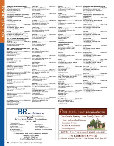 ADVERTISING AND MEDIA #NEWSPAPERS Maggie Razdar ......................................(248) 481-7127 Kids Standard Publications, Inc. P.O.Box 1442, Clarkston, MI 48347 www.kidsstandard.org AGED SERVICES #RETIREMENT COMMUNITITES #SENIOR CARE #ASSISTED LIVING Reeta Smith ..........................................(248) 625-1280 Redwood Inc. 6100 S. Main, Clarkston, MI 48346 www.redwoodinc.org Susan Hammersmith..............................(248) 674-9292 Canterbury-on-the-Lake 5601 Hatchery Rd., Waterford, MI 48329 www.canterburyonthelake.com Barb Rollin .............................................(248) 625-8231 Independence Township Senior Community Center 600 Clarkston Rd., Clarkston, MI 48348 http://indetwp.com/residents/senior_center/index.php ARTS, CULTURE AND ENTERTAINMENT#FAMILY, COMMUNITY AND CIVIC ORGANIZATIONS Sara Sanger ...........................................(586) 822-6255 Clarkston Village Players 4861 White Lake Rd., Clarkston, MI 48346 www.clarkstonvillageplayers.org FAMILY, COMMUNITY AND CIVIC ORGANIZATIONS #NON-PROFIT ORGANIZATIONS Bob Murdock .........................................(248) 892-9116 Clarkston Area Lions Club P.O.Box 207, Clarkston, MI 48347 www.clarkstonlions.org Norma Okonski ......................................(248) 309-3658 Oakland Hope 373 Summit Dr., Waterford, 48328 http://oaklandhope.org Shaun Hayes ..........................................(248) 625-8055 Clarkston Area Chamber of Commerce 5856 S. Main St., Clarkston, MI, 48346 www.clarkston.org Susan Julian ..........................................(248) 795-2808 North Oakland Headwaters Land Conservatory PO Box 285., Clarkston, MI, 48347 www.nohlc.org Mike Cormier..........................................(810) 835-1435 3rd Circle Inc. 39 S. Main St. Ste 2., Clarkston, MI, 48346 3rdcircleinc.com Julie Featherston ....................................(248) 663-3508 American Cancer Society 20450 Civic Center Dr., Southfield, MI 48076 www.cancer.org Kathi Luis ..............................................(877) 269-5643 Amyloidosis Foundation 7151 N. Main #2, Clarkston, MI 48346 amyloidosis.org Rob Whitcomb .......................................(248) 620-2984 Clarkston Area Optimist Club P.O. Box 891, Clarkston MI 48347 www.clarkstonoptimists.org/