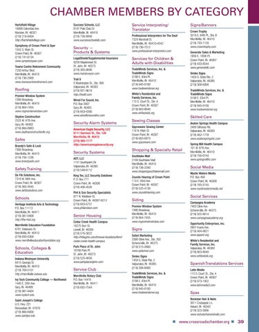 CHAMBER MEMBERS BY CATEGORY Hartsfield Village 10000 Columbia Ave. Munster, IN 46321 (219) 218-8404 http://hartsfieldvillage.com Symphony of Crown Point & Dyer 1555 S. Main St. Crown Point, IN 46307 (219) 741-8134 www.symphonypan.com Towne Centre Retirement Community 7250 Arthur Blvd. Merrillville, IN 46410 (219) 736-2900 www.townecentreretirement.com