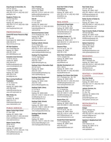 Greg Krueger & Associates, Inc. 4475 W. 42nd St. Hastings, NE 68901-1705 (402) 462-3232 • f: (402) 462-2037 gkai@gtmc.net Vaughans Printers, Inc. 222 East Side Blvd. P.O. Box 128 Hastings, NE 68902-0128 (402) 463-7721 • f: (402) 463-1009 vip@gtmc.net www.vaughansprinters.com Professionals Central NE Human Resources Mgt. Assoc. P.O. Box 932 Grand Island, NE 68802-0932 (308) 380-8210 http://cnhrma.shrm.org HR Total Solutions 5914 Quail Ridge Ave. Hastings, NE 68901 (402) 461-5559 john.hill059@yahoo.com Innovative Grant Services 10100 W. 42nd St. Juniata, NE 68955 (402) 460-6572 kris@innovativegrants.com www.innovativegrants.com J & K Possibilities 1138 N. Denver Ave. Hastings, NE 68901 (402) 463-2756 jduval@gmail.com Mary Lanning Healthcare Foundation 741 N. Denver Ave. P.O. Box 2063 Hastings, NE 68902-2063 (402) 460-5600 mplock@marylanning.org www.mlhf.org/contact-us Mike Henke, Inc. 15 Sonja Dr. Doniphan, NE 68832 (308) 379-7775 mikehenkeinc@gmail.com www.mikehenkeinc.com Public Services Adams Central High School P.O. Box 1088 Hastings, NE 68902-1088 (402) 463-3285 • f: (402) 463-6344 shawn.scott@adams-central.org www.adamscentral.us Adams County Offices 500 W. 4th St. P.O. Box 2067 Hastings, NE 68902-2067 (402) 461-7107 • f: (402) 461-7185 rthomas@adamscounty.org www.adamscounty.org