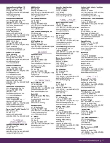 Professionals Balanced Books, LLC 317 N. Kansas Ave. Hastings, NE 68901-7508 (402) 462-5544 • Fax: (402) 462-5548 jan@balancedbooksllc.com www.balancedbooksllc.com Central NE Human Resources Mgt. Assoc. P.O. Box 932 Grand Island, NE 68802-0932 (308) 380-8210 http://cnhrma.shrm.org Efficiency Counts 422 N. Hastings Ave. Hastings, NE 68901-5169 (402) 460-6216 • Fax: (402) 463-0185 crh@efficiencycounts.com www.efficiencycounts.com H & R Block 1011 W. 2nd St. P.O. Box 47 Hastings, NE 68902-0047 (402) 462-5282 • Fax: (402) 461-3597 jbittfield@hrblock.com www.hrblock.com