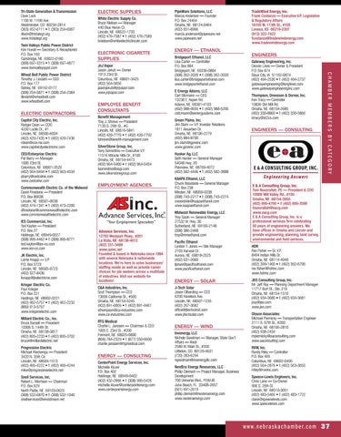 ELECTRIC CONTRACTORS Capitol City Electric, Inc. Rodger Dean — COO 4220 Lucile Dr., #1 Lincoln, NE 68506-6004 (402) 420-7435 • f: (402) 420-7436 rdean@cce-ne.com www.capitolcityelectricinc.com CED/Enterprise Electric Pat Barry — Manager 1600 23rd St. Columbus, NE 68601-3520 (402) 564-9494 • f: (402) 563-4534 pbarry@cedcolne.com www.cedcolne.com Commonwealth Electric Co. of the Midwest David Firestone — President P.O. Box 80638 Lincoln, NE 68501-0638 (402) 474-1341 • f: (402) 473-2200 dfirestone@commonwealthelectric.com www.commonwealthelectric.com IES Commercial, Inc. Ted Kayton — President P.O. Box 27 Holdrege, NE 68949-0027 (308) 995-4462 • f: (308) 995-8771 ted.kayton@ies-co.com www.ies-co.com JK Electric, Inc. Lorrie Knapp — V.P. P.O. Box 5723 Lincoln, NE 68505-0723 (402) 327-8436 lknapp@jkelectricne.com Krieger Electric Co. Paul Krieger P.O. Box 221 Hastings, NE 68902-0221 (402) 462-5757 • f: (402) 462-2232 (800) 913-5757 www.kriegerelectric.com Millard Electric Co., Inc. Bruce Barsell — President 10306 S. 144th St. Omaha, NE 68138-3817 (402) 895-2233 • f: (402) 895-3702 bruce@millardelectric.net Progressive Electric Michael Klockenga — President 3420 N. 35th Cir. Lincoln, NE 68504-1513 (402) 466-4222 • f: (402) 466-4244 mike@progressiveelectric.net Snell Services, Inc. Robert L. Morrison — Chairman P.O. Box 629 North Platte, NE 69103-0629 (308) 532-6870 • f: (308) 532-1040 snellservices@windstream.net
