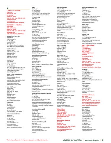 S S.W.M. Co., Inc./Blauer Mfg. Elvest Cook 56 County Rd. 166 P.O. Box 1438 Oxford, MS 38655 (662) 281-0097 • Fax: (662) 281-0403 ecook@blauer.com www.blauer.com Industry, Manufacturing, Warehouse S&J Art Gallery & Collectibles John Adams 1010 Jackson Ave. Oxford, MS 38655 (662) 234-8139 • Fax: (662) 234-8729 oxfrda@aol.com Gifts, Picture Framing, Retail Stores Safe and Sound Home Care Sharon Morris 1603 University Ave. P.O. Box 2136 Oxford, MS 38655 (662) 234-1221 sharon@safeandsoundhomecare.com Home Health Services, Sitting Services SafeHome Keepers Mariamne Young 1739 University Ave., #136 Oxford, MS 38655 (662) 832-8328 mbyoung7@gmail.com Home Watch Services Salvation Army Lisa Coleman 2649 W. Oxford Loop P.O. Box 1581 Oxford, MS 38655 (662) 236-2260 • Fax: (662) 236-2224 lisa_coleman@uss.salvationarmy.org Civic & Social Organizations, Nonprofit Organizations Sample & Poole Properties, LLC Meta Poole Ginn 428 N. Lamar Blvd., Ste. 102 Oxford, MS 38655 (662) 234-0808 • Fax: (662) 234-0807 meta@sampleandpoole.com www.sampleandpoole.com Real Estate, Real Estate Brokers Sayle Oil & Propane Johnny Sayle 12650 Hwy. 32 Water Valley, MS 38935 235 Elm St. Oxford, MS 38655 (662) 809-1424 jsayle@sayleoil.com www.sayleoil.com Gas & Propane, Retail Stores Scape Savers Cliff Smith 303 O’Hara Dr. Oxford, MS 38655 (662) 820-5764 bigrebcc@gmail.com Lawn Maintenance, Lawn Mowing Scott Construction Services James Scott 304 Winners Cir. P.O. Box 2999 Oxford, MS 38655 (662) 832-3782 james25tobe@gmail.com http://scsoxford.com Construction Companies, General Contractors & Developers