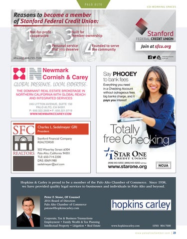 Hopkins & Carley is proud to be a member of the Palo Alto Chamber of Commerce. Since 1938, we have provided quality legal services to businesses and individuals in Palo Alto and beyond. Peter F. Stone, Of Counsel 2014 Board of Directors Palo Alto Chamber of Commerce pstone@hopkinscarley.com Corporate, Tax & Business Transactions Employment • Family Wealth & Tax Planning Intellectual Property • Litigation • Real Estate