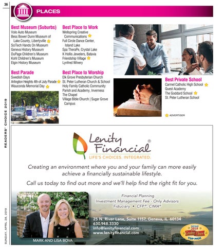 Call us today to find out more and we’ll help find the right fit for you. Financial Planning Investment Management Fee - Only Advisors Fiduciary • CFP ®, CIMA® 25 N. River Lane, Suite 1157, Geneva, IL 60134 630.948.3330 info@lenityfinancial.com www.lenityfinancial.com MARK AND LISA BOVA