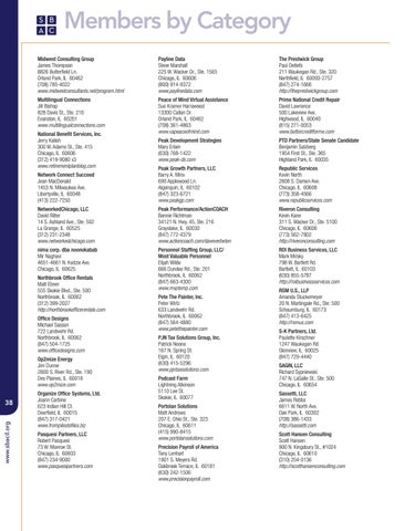 Pete The Painter, Inc. Peter Wirtz 633 Landwehr Rd. Northbrook, IL 60062 (847) 564-4880 www.petethepainter.com PJN Tax Solutions Group, Inc. Patrick Noone 167 N. Spring St. Elgin, IL 60120 (630) 415-5296 www.pjntaxsolutions.com Podcast Farm Lightning Atkinson 5110 Lee St. Skokie, IL 60077 Portolan Solutions Matt Andrews 207 E. Ohio St., Ste. 323 Chicago, IL 60611 (415) 990-8415 www.portolansolutions.com Precision Payroll of America Tony Lenhart 1901 S. Meyers Rd. Oakbrook Terrace, IL 60181 (630) 242-1506 www.precisionpayroll.com