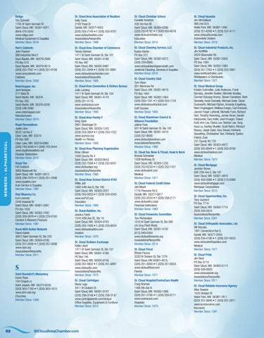 St. Cloud Medical Group Kristen Guthmiller, Julie Anderson, Frank Barnaby, Jennifer Boelter, Michelle Bradley, Carmen Buiceag-Arama, Steven Danielson, Beth Donnelly, Kevin Donnelly, Michael Dorle, Diane Duckworth, Michael Eighan, Amanda Engelking, Mark Engelsgjerd, Melissa Ensign, Carl Erickson, Jasmin Folger Latterell, Michelle Funk, Richard Hart, Timothy Hemming, James Hover, Gerald Kiedrowski, Gary Kolle, Joan Krueger, Traese Kuhl, Ann Lee, Elaina Lee, Nathan Lee, Yang Koua Lo, Bartley Mueller, Scott Rahm, Richard Rysavy, Liaqat Sabir, Gary Snead, Kimberly Spaulding, Christopher Tacl, Kimberly Tjaden, Patrick Zook 251 County Rd 120 Saint Cloud, MN 56303-4872 (320) 202-8949 • f: (320) 202-0756 www.stcloudmedical.com Medical Member Since: 1975 St. Cloud Mortgage Jennifer Brown 606 25th Ave S, Ste 101 Saint Cloud, MN 56301-4810 (320) 493-5585 • f: (320) 215-0300 www.stcloudmortgage.com Mortgage Corporations Member Since: 2015 St. Cloud Opportunities, Inc. Tony Goddard PO Box 7716 Saint Cloud, MN 56302-7716 (320) 345-0316 Associations/Nonprofits Member Since: 2001 St. Cloud Orthopedic Associates, Ltd. Bill Worzala 1901 Connecticut Ave S Sartell, MN 56377-2554 (320) 259-4100 • f: (320) 257-5523 www.stcloudorthopedics.com Medical Member Since: 1971 St. Cloud Pride Jim Beck PO Box 5114 Saint Cloud, MN 56302-5114 (320) 428-0020 www.stcloudpride.org Associations/Nonprofits Member Since: 2011 St. Cloud Reliable Insurance Agency Mike Sweere 1625 Division St Waite Park, MN 56387-1811 (320) 251-9040 • f: (320) 251-2011 www.scrinsurance.com Insurance Member Since: 1991