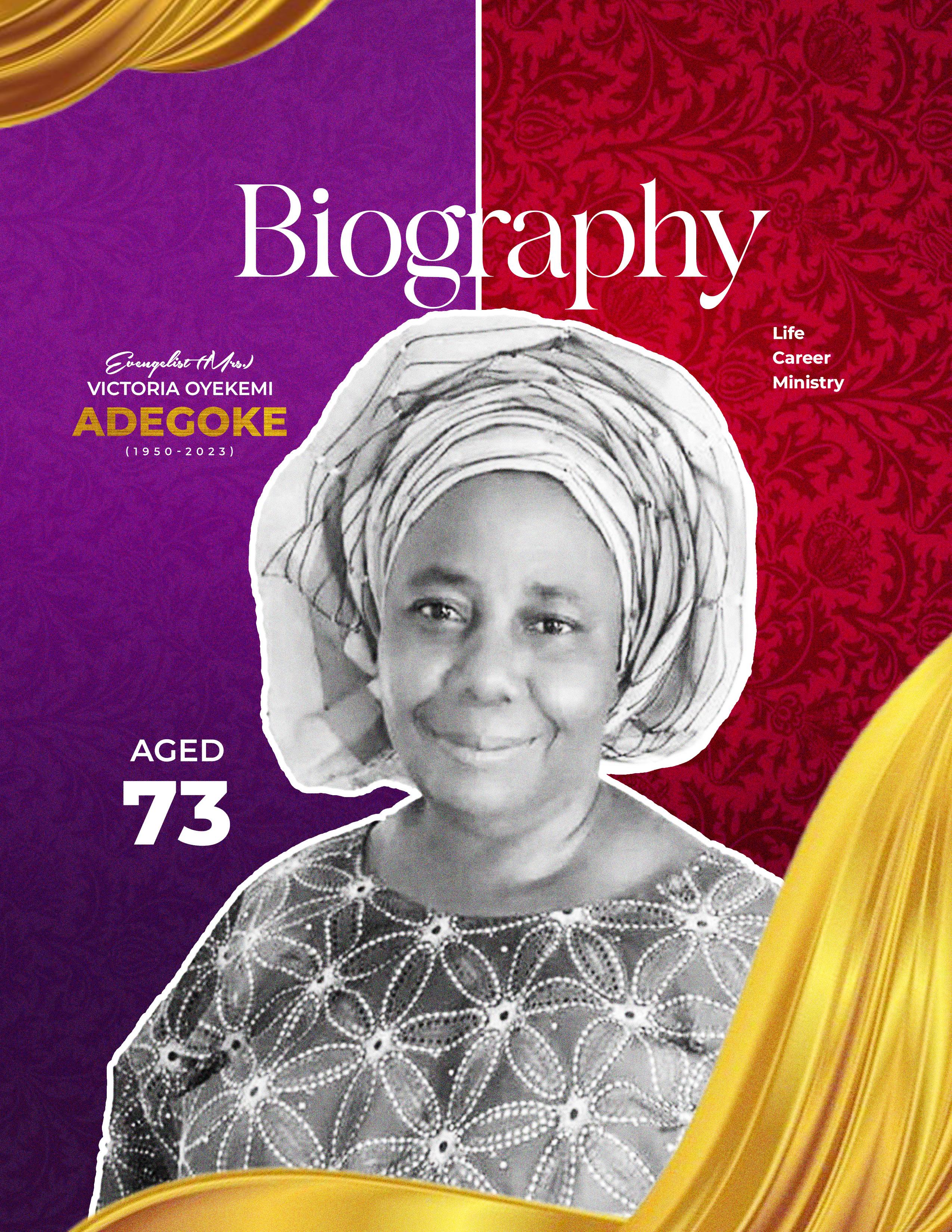 Evangelist (Mrs.) Victoria Oyekemi Adegoke started ministry tutelage (tulle) at CAC Oke And Ikon, Elbe Lagos, under the supervision of Late Pastor Otunla between 1990-1992. Between 1992 and 1995, she was directed by the Holy Spirit to CAC Headquarters Ikon, Sun State for another round of tutelage (tulle) under supervision of Pastor Fadipe. In 1993, she was sent to CAC (Oke Ayo) Apomu, in Osun State as an evangelist in training. This spanned for a year. She was shepherded by Pastor Olu Eyebiokun.