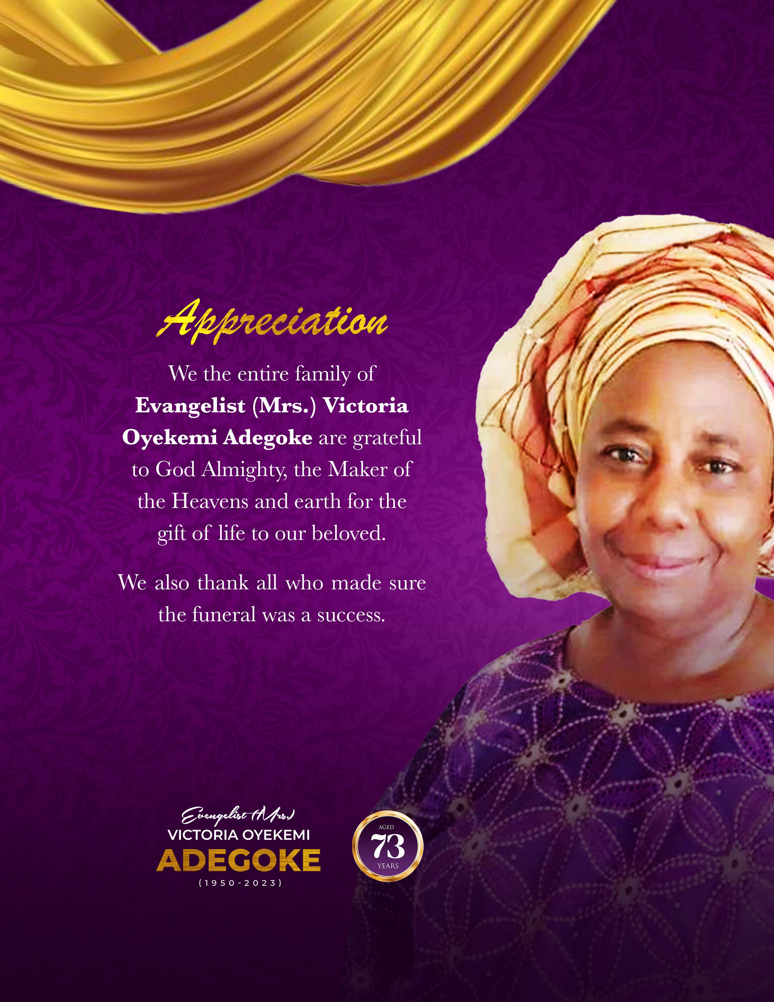 Evangelist (Mrs.) Victoria Oyekemi got married to her heartthrob in 1972. They became co-labourers in God’s vineyard and they are blessed with four godly biological children many spiritual children and many grandchildren.