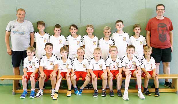 Hintere Reihe (von links nach rechts): Carsten Eberhardt (Trainer), Tino Gers tenecker, Phil Preuß, Clemens Kölbl, Till Eberhardt, Lennard Körner, Tim Hofmann, Jonas Bornmann und Marten Preuß (Betreuer). Vordere Reihe (von links nach rechts): Bosse Schmidt, Ben Louis Rohde, Felix Schnit ker, Niklas Scheuch, Ben Oscar Giese, Luca Wagner, Pepe Schmidt und Julius Hofmann. Nicht ab gebildet: Uros Djuric