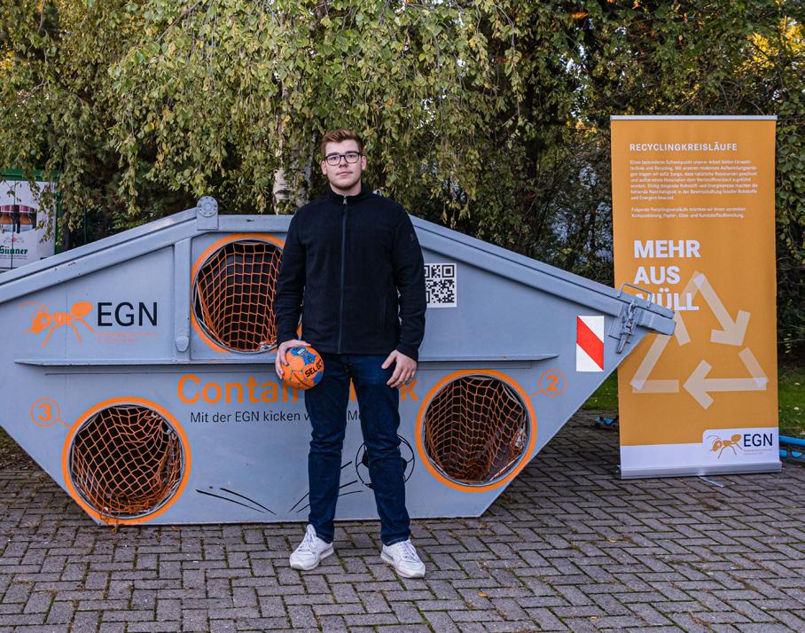 Die EGN hatte vor der Halle ihren Stand aufgebaut und bot den TSVFans eine Torwand im RecyclingContainer-Style. Im Rahmen der Nachhaltigkeit ist der RecyclingBereich für das Unternehmen ein wichtiger Baustein.