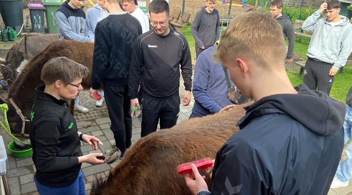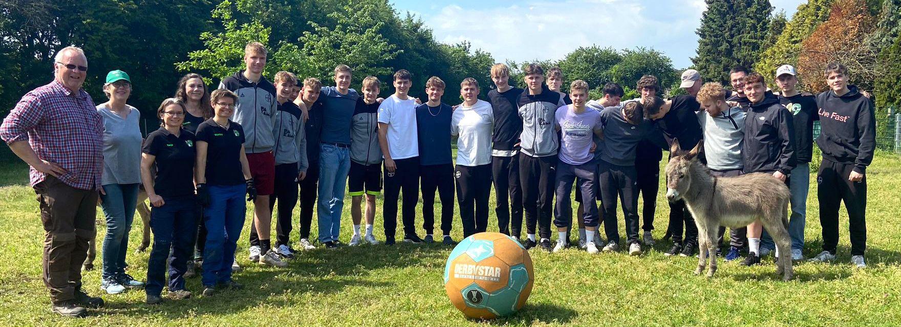 Schon länger war Trainer Martin Berger mit dem Zonser Eselpark-Chef Peter Norff im Gespräch. Vor kurzem klappte es, die A-Jugendlichen des TSV Bayer Dormagen konnten einen Sozialtag auf dem Gnadenhof verbringen und packten dabei kräftig an. Sie erhielten Arbeitsmittel, mit dem sie die Esel putzten, fütterten die Tiere und reinigten den Stall. Was die Jungs vor Ort erfuhren: Esel haben eine unfassbar beruhigende Wirkung auf Menschen. Deshalb auch suchen zum Beispiel Altenheime mit ihren Seniorinnen und Senioren den Kontakt mit den sympathischen Vierbeinern. Für Peter und Darinka Norff ist es eine Herzensangelegenheit, einen Esel aus schlechter Haltung oder vor dem Schlachter zu retten: „In den vielen Jahren, in denen