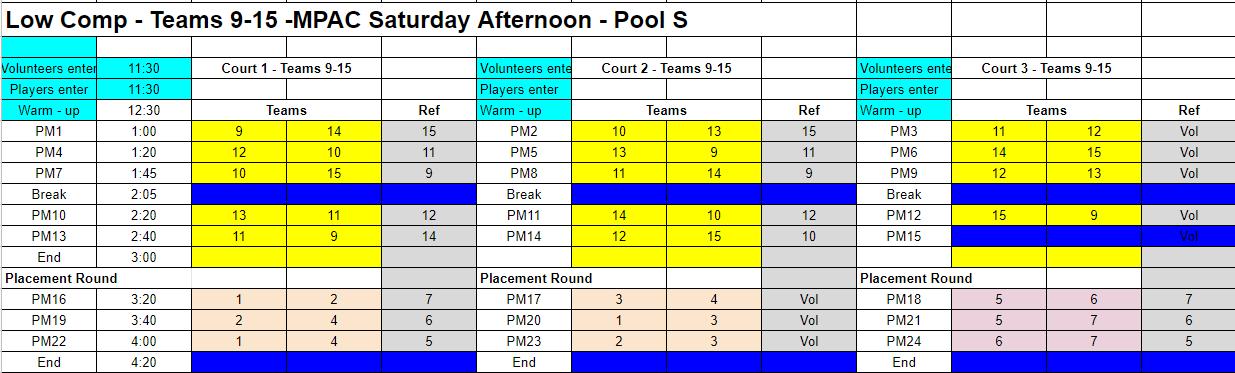 The schedule is always tight and is a guideline Round Robin will be timed sets because there are cross court playing and reffing responsibilities The TC will announce the start of play/1 min remaining and sound an airhorn when play must end If there is a point in play, complete the point If the set is tied play one more point Playoffs will have the continuous play policy in effect If a match finishes early, the next set will begin immediately All teams and Captains are responsible for ensuring your team is arriving at the court to play or ref on time (ie minimum 5 min early) See Tournament Rules for late penalties