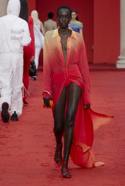 E / The evening glow, described in its shades by all the poets of this world, has always evoked a feeling of calm and contemplation in people with its yellow, red and orange tones. This sunset effect with its extravagant dip-dye shades is currently dominating the international catwalks. On body-hugging silhouettes by designers Etro, Ferragamo, Zimmermann and Courrèges, to name a few, we can experience firsthand the vitality and power source of these colors. This season, they will not only be seen on Instagram, but will also prevail in our closets.