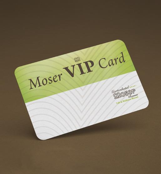 D / Mit unserer Bonuskarte, der Moser VIP Card, möchten wir uns bei Ihnen für Ihr Vertrauen und Ihre Treue bedanken. Holen Sie sich Ihre Moser VIP Card und sammeln Sie bei jedem Aufenthalt und mit jeder gebuchten Zusatzleistung Punkte, die Sie bei Ihrem nächsten Urlaub im Gartenhotel Moser einlösen können. Das Team der Rezeption steht Ihnen jederzeit für Fragen und Wünsche zur Verfügung. Wir freuen uns, Ihnen Ihre persönliche Karte zu überreichen!