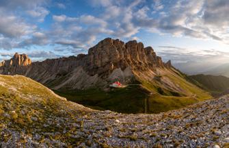 I / Tutte le strade portano al Rifugio Alpe di Tires, verrebbe da dire. Situato sull’omonimo passo, infatti, è il punto di incrocio di numerosi itinerari escursionistici della zona: dall’Alpe di Siusi al Catinaccio o dallo Sciliar al Sassolungo e al Sassopiatto. Il rifugio “dal tetto rosso” si trova a 2500 m di altitudine e ha una storia lunga cinquant’anni: grazie alla sua capacità di unire tradizione e modernità è stato insignito del Premio Architettura Alto Adige.