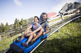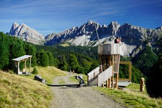 E / The adventure high ropes course Col de Flam offers plenty of action for both young and old from June to September. Located near the valley station of the Seceda cable car in Ortisei, visitors from the age of 4 can gain their first practical climbing experience, whereas the adults can climb up to dizzying heights. The 180-metre zip line and 480-metre fly line will take them downhill with great momentum. In addition, four large trampolines provide lots of fun and keep the whole family fit.