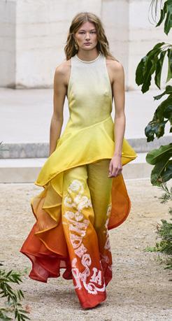 D / Die Abendröte, von allen Poeten dieser Welt in ihren Schattierungen beschrieben, ruft mit Gelb-, Rot- und Orangetönen seit jeher ein Gefühl von Ruhe und Besinnlichkeit hervor. Dieser Sonnenuntergangseffekt mit seinen extravaganten Dip-Dye-Schattierungen beherrscht derzeit die internationalen Laufstege. Auf körpernahen Silhouetten der Designer Etro, Ferragamo, Zimmermann und Courrèges – um nur einige zu nennen – können wir die Vitalität und Kraftquelle dieser Farben hautnah miterleben. In dieser Saison werden sie nicht nur auf Instagram zu sehen sein, sondern auch in unseren Kleiderschränken vorherrschen.