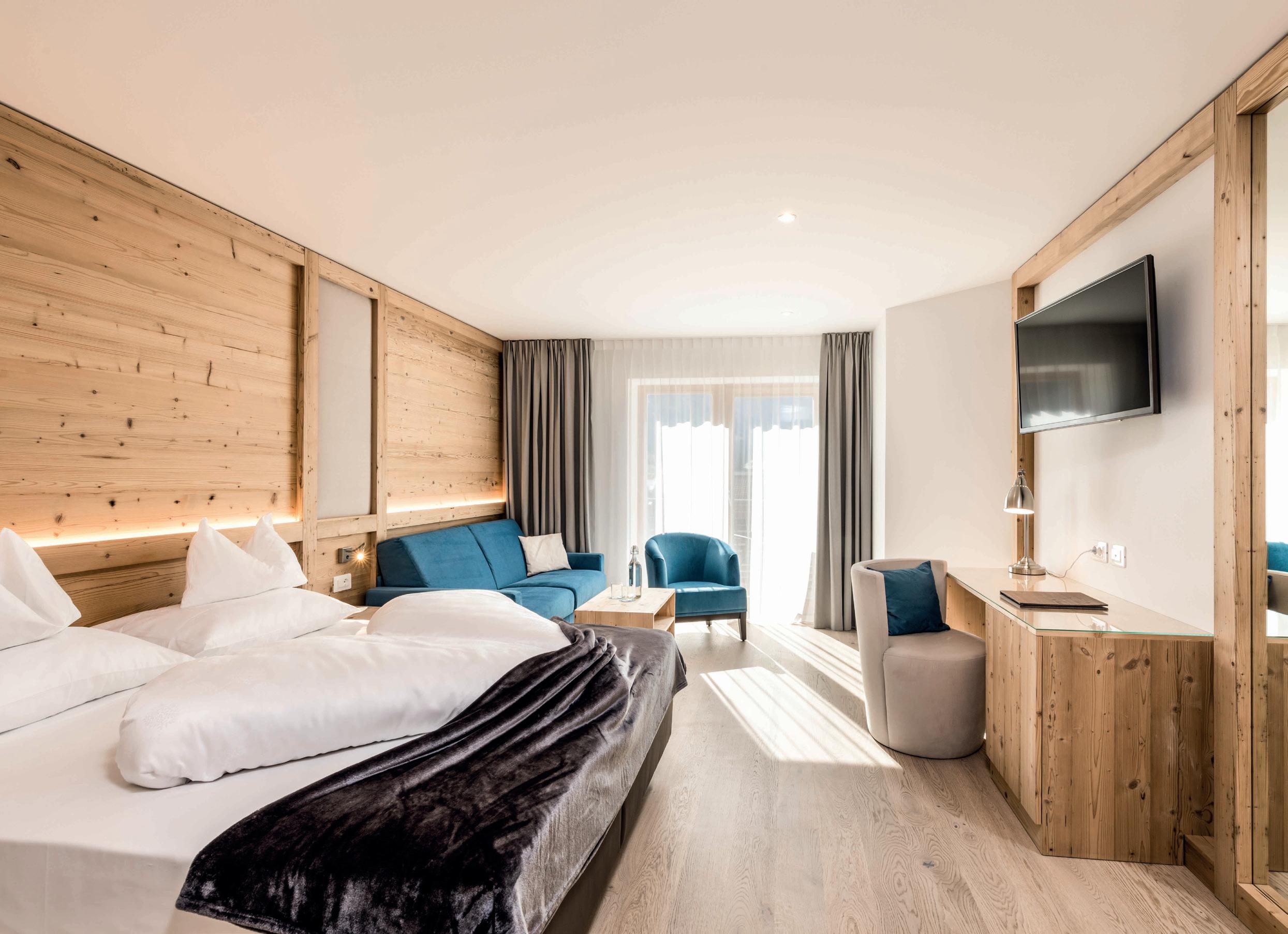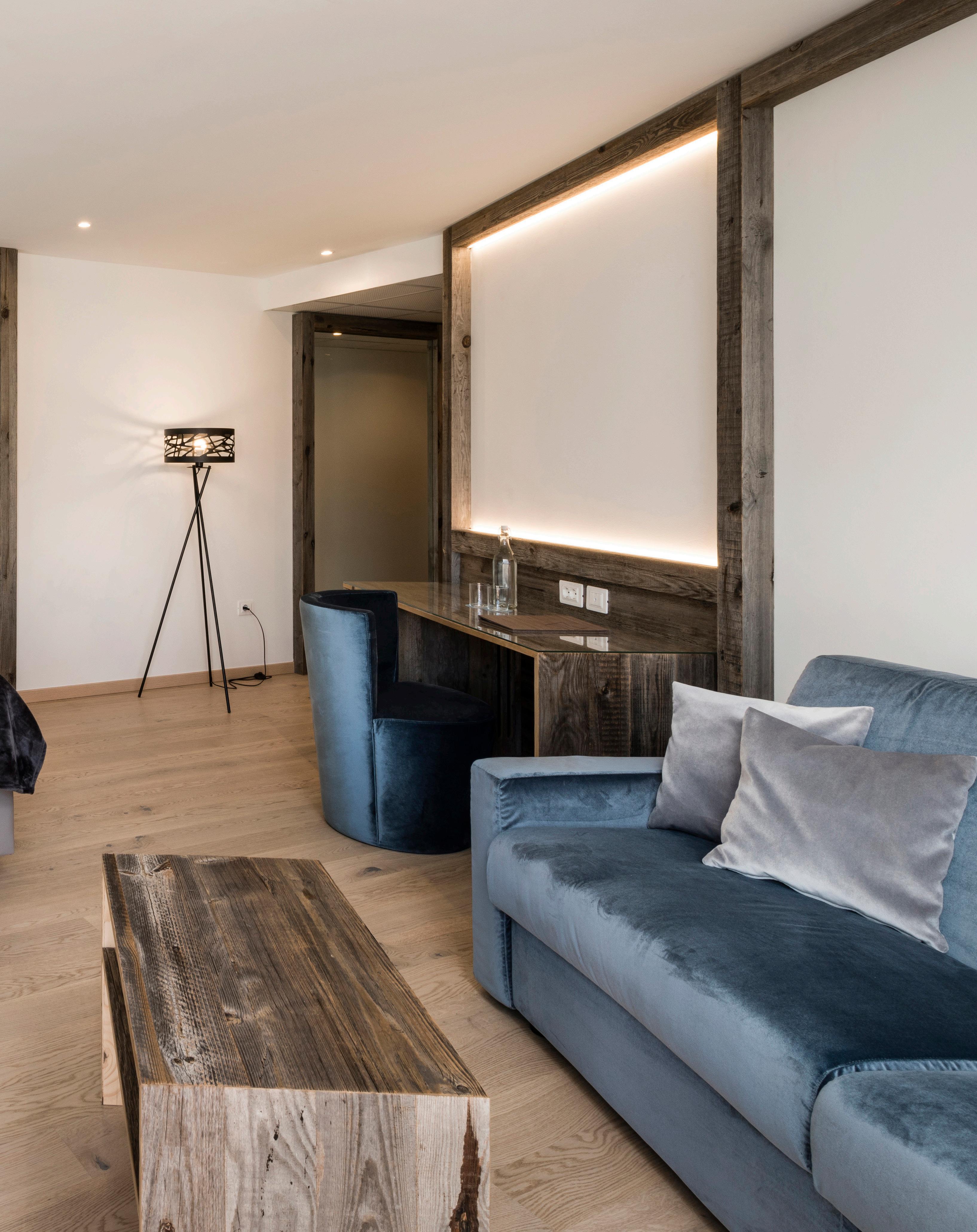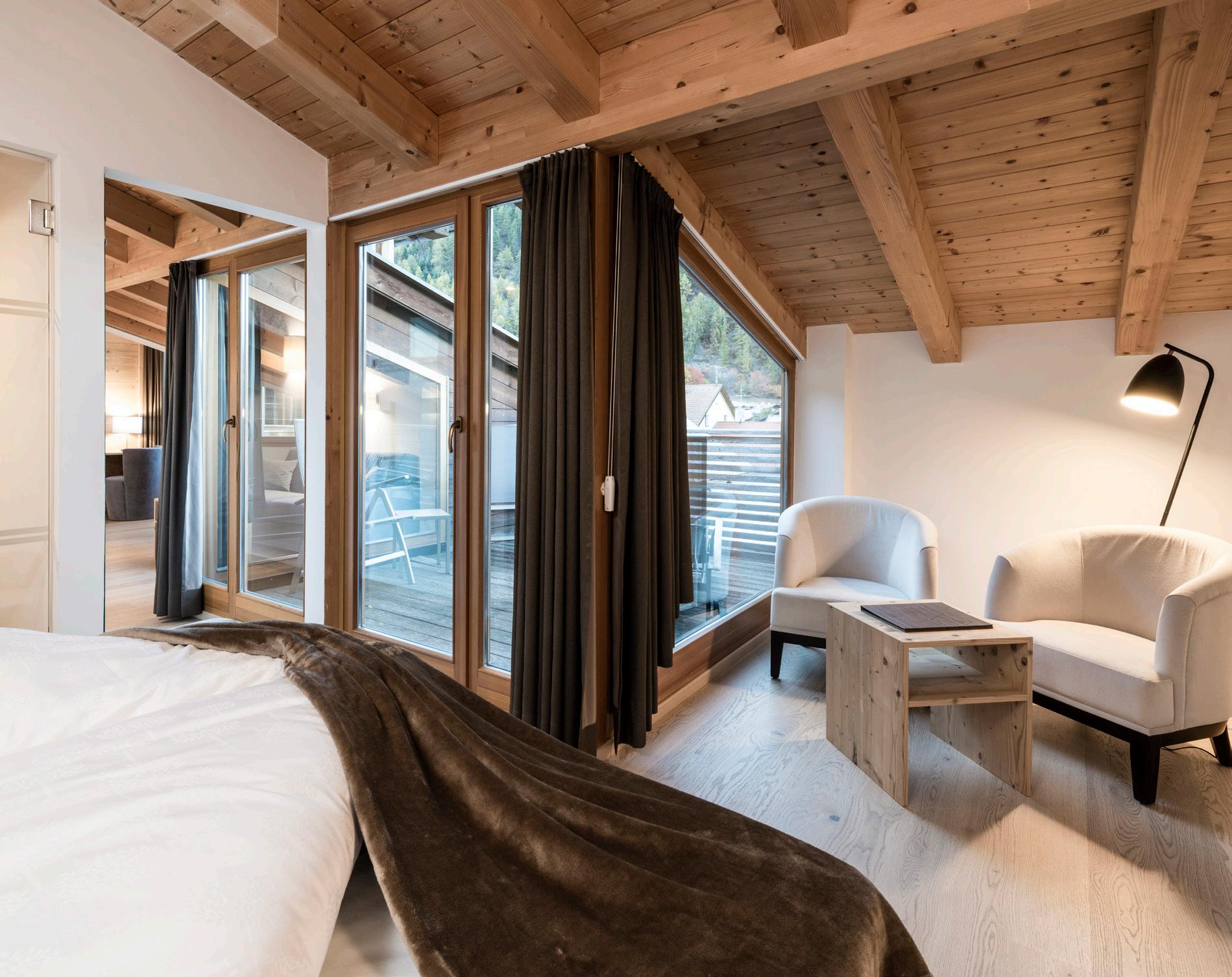 Große Suite mit Interieur aus Zirbenholz, Holzboden, trennbarem Schlafund Wohnbereich, begehbarem Kleiderschrank, Balkon mit Blick auf den Vinschgau und die Schweiz sowie Bad mit Dusche, Badewanne und Bidet.