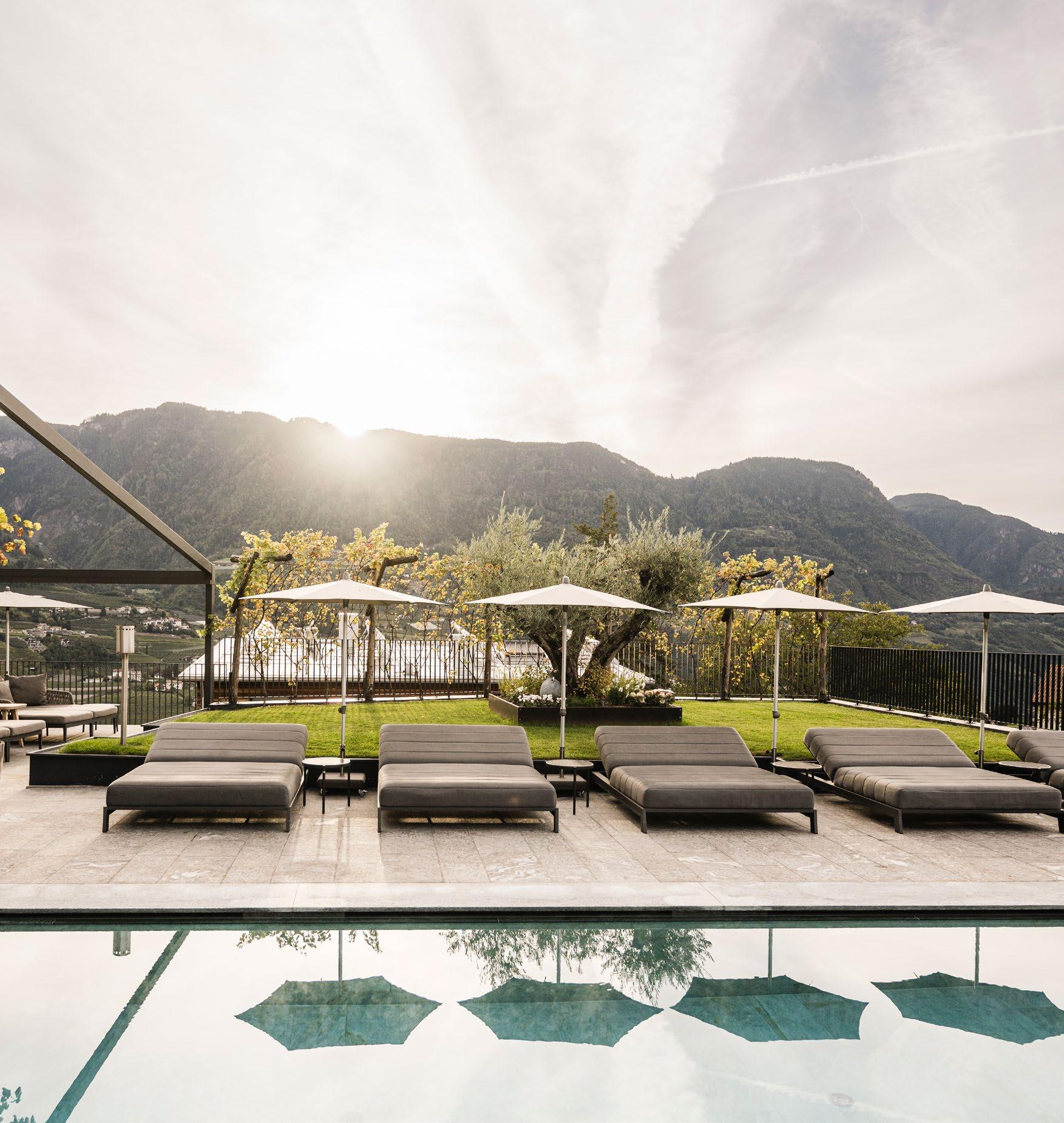 Den Blick von der Panoramaterrasse über die Erdpyramiden bis zu den Bergen wandern lassen: Näher kann man der Natur kaum sein. Sie spiegelt sich sowohl im Kastanienholz der Ferienwohnungen als auch im Wasser des Infinitypools wider und verspricht Abenteuer und Erholung.