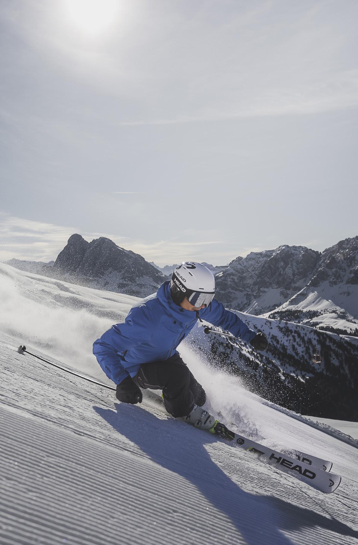 Top präparierte Pisten, frische Bergluft, beste Fernsicht: So lauten die drei Versprechen, die dazu animieren, im Dezember wieder die Skier aus dem Keller zu holen. Damit der erste Tag auf der Piste nicht nach einer Abfahrt im Gasthaus – oder schlimmer noch: in der Notaufnahme – endet, gilt es einiges zu beachten. „Die Skier sollten vor dem Start immer gewartet werden“, weiß Alex von Sport Alfredo. „Die Kanten müssen scharf gemacht und eventuelle Schäden am Belag ausgebessert werden. Gutes Skiwachs darf natürlich nicht fehlen, und auch die Bindungen gehören vor Saisonbeginn überprüft.“ Alex ist nicht nur Geschäftsführer des Skiverleihs und Sportgeschäfts in Corvara, sondern schwingt sich auch selbst gerne kurvenreich durch den Schnee. Er kennt einige Tipps für das Skigebiet Alta Badia direkt vor seiner