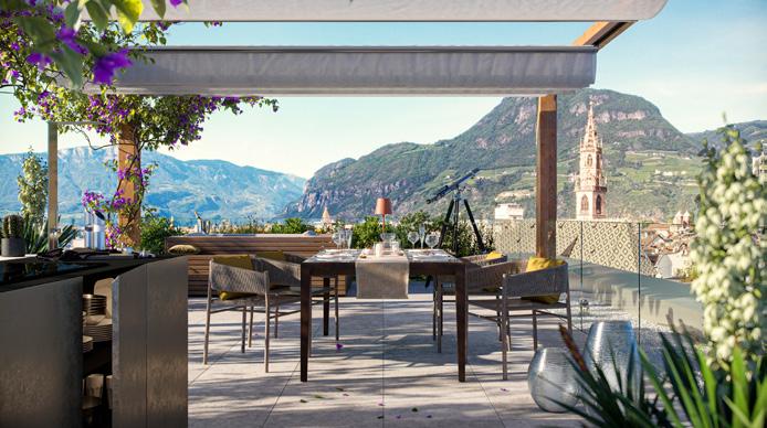 altoatesino, tra la stazione ferroviaria e il centro storico, eppure facilmente accessibili in auto e isolate di rumori cittadini. I lavori sono ancora in corso, ma l’eleganza della facciata e dell’intero complesso si lascia già intuire chiaramente. Questo progetto, innovativo e sostenibile, è stato ideato dall’architetto Sir David Chipperfield, vincitore del Premio Pritzker nel 2023, e si caratterizza per particolarità davvero esclusive. Gli appartamenti si sviluppano sul tetto dell’edificio mentre, a 15 m di altezza, si trova un’area verde con giardini privati; le soluzioni con loggia e terrazza ai piani superiori regalano una vista panoramica senza paragoni e dagli attici è possibile am-