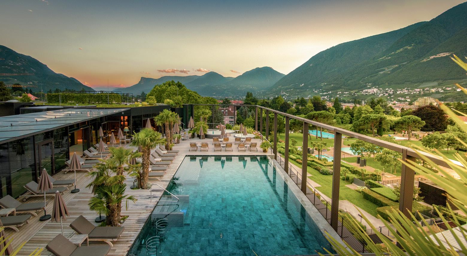 you guys, seriously, how big…”. He was about to say something grand, but was interrupted by Johannes: “The Meran arcades are 400 m long and were built by Meinhard II, Count of Tyrol, in the mid 13th century…”. Paul Nikolaus followed, carrying two bags with salads, flowers and herbs sticking out of them. “Meran market,” he huffed, “everything is 100% from South Tyrol. Brilliant!”. After Johannes interrupted us with: “Ah yes, by the Prince’s Castle, where Emperor Maximilian spent a night in 1516...” we continued. One group was to explore Lagundo, the other Lana. Laura had Algund Balance on her programme. The day was to begin with a walking massage, followed by a Kneipp walk and a detour to the Gardenflair, where the wealth of Mediterranean plants is on display, followed by a hiking tour and forest bathing. Johannes interjected: “The Anker study, which was launched in 2019, proves that hiking in the mountains and forest bathing signif-