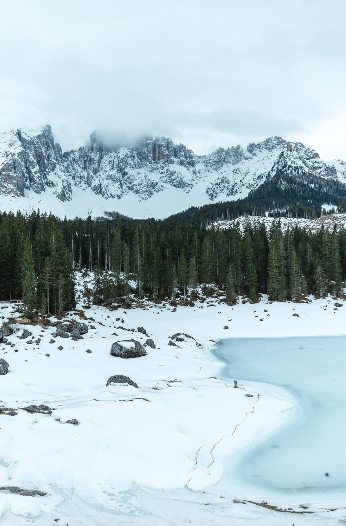 Lake Carezza is nestled beneath a layer of ice, while winter paints a picturesque and serene landscape.