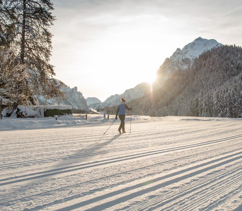 Your first step is a gentle glide, the snow softly crunching under your skis. The trail leads from the edge of the village of San Vigilio deep into the Marebbe Valley and all the way to the Pederü Mountain Inn. It takes you 23 km through quiet forests and white meadows in the Fanes-Sennes-Braies Nature Park. Along the way, there are various cross-country ski trails, huts in which to warm up in and a stunning panorama to enjoy. Whether classic or skating: the trail is perfectly groomed. If you're still learning, the San Vigilio ski school offers cross-country skiing courses.