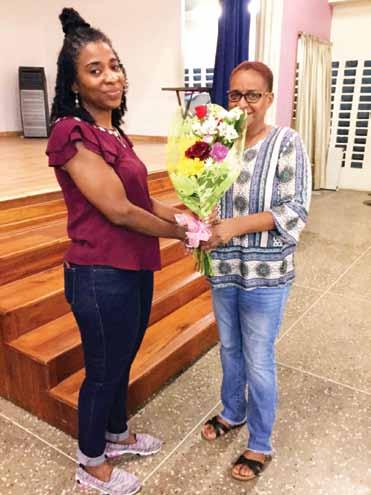 Cruzers Zonal Communication Officer, Jacqueline Austin presents a bouquet to ‘Pain & Nutrition Therapist’ Mrs. Anna Kay Seaton after a lecture at the February 2020 monthly meeting.