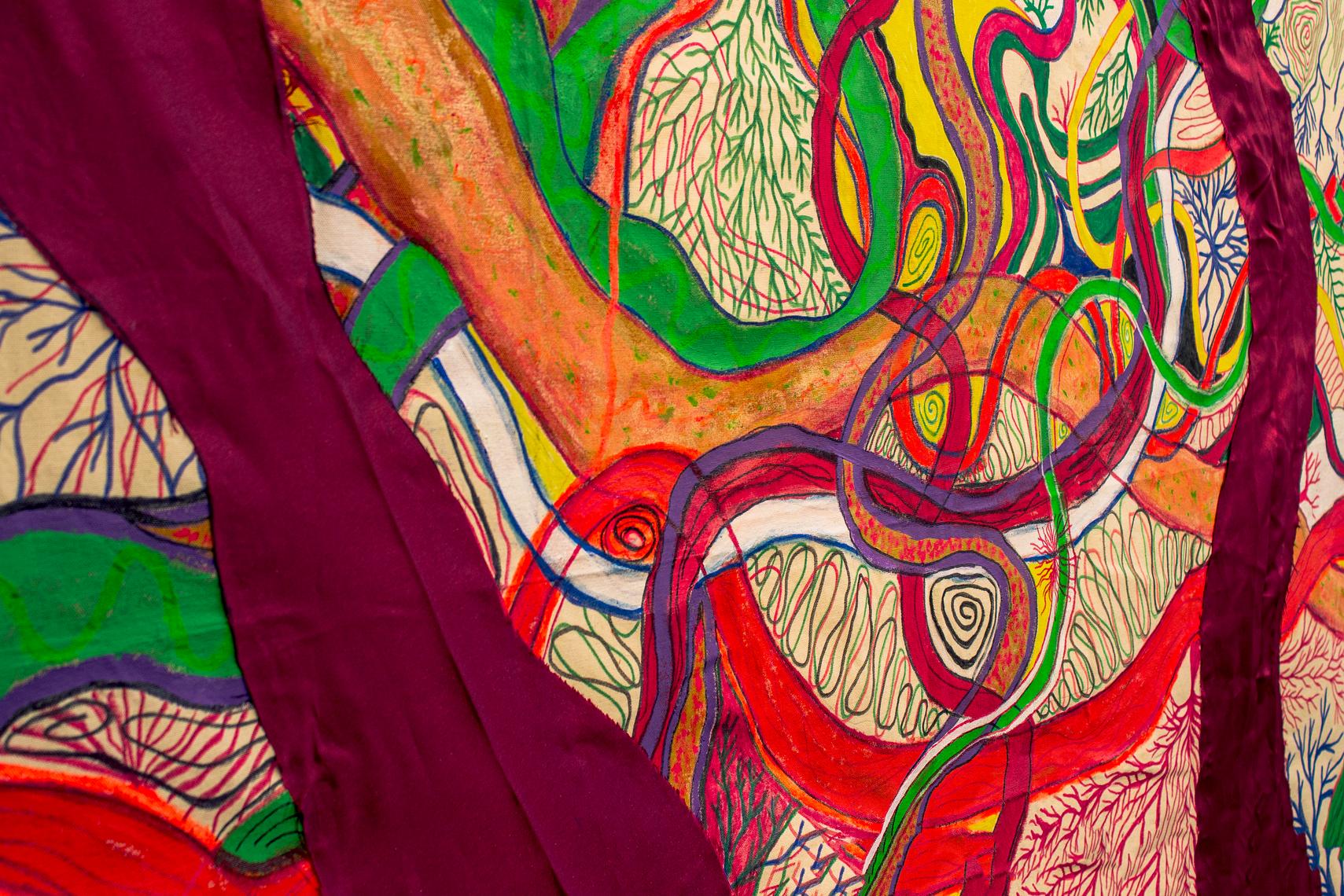 Valter Mesquita brings his own body in the sculpture Duplo (2024) in Manaus, and then the digital image of bodies in Porto Alegre entitled Ramific[ação] (2024), to represent and question the multiple in its differences in the encounter. Mariene Mendonça presents us with two works in book format, Casa de Bicho (2024) and A Semi Floresta Vermelha (2024), bringing together a series of collection materials and engravings with their implicit meanings in relation to the local animals and their context. With their paintings, two artists evoke the popular oral narrative of one of the Amazon's imaginary characters: the Cobra Grande or Boiúna. Roberto Azevedo with A Cobra Grande da Comunidade São Francisco (2024), which refers to the supernatural phenomena that haunt the riverside dwellers in their daily coexistence with the rivers Priscila Pinto, with Travessia (2024) and Atravessamentos (2014), proposes, through the snaking movement of the snake, a reading of the space between the two ports and the wooden walkways of the Vila Gutierrez community, through her paintings. With her works Adorable New World (2024) and Affective Remembrance (2024), Samantha Karlia delights us with her perspectives in vibrant colors on circular surfaces. At the same time, she connects us to the urbanities of Manaus and the Gutierrez Community and their complementary symbolic elements.
