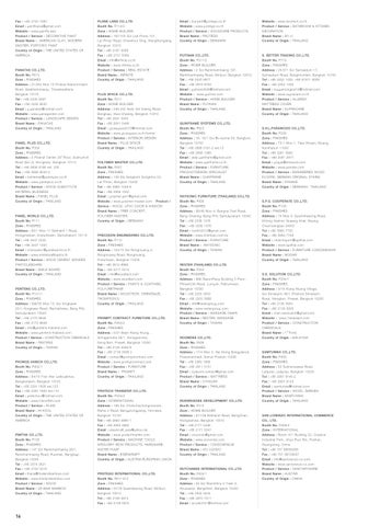 PLANE LAND CO.,LTD. Booth No. F114/2 Zone : HOME BUILDER Address : 787/102 Soi Lad Phrao 101, Lat Phrao Road, Chaokhun Sing, Wangthonglang, Bangkok 10310 Tel : +66 2187 0088 Fax : +66 2731 5064 Email : info@infinite.co.th Website : www.infinite.co.th Product / Service : REAL ESTATE Brand Name : INFINITE Country of Origin : THAILAND PLUS SPACE CO.,LTD. Booth No. F211 Zone : HOME BUILDER Address : 236-242 Asok Din Daeng Road, Bangkapi, Huai khwang, Bangkok 10310 Tel : +66 2641 5445 Fax : +66 2641 5446 Email : plusspace2010@hotmail.com Website : www.plusspace.co.th/home/ Product / Service : INTERIOR DESIGN Brand Name : PLUS SPACE Country of Origin : THAILAND POLYMER MASTER CO.,LTD. Booth No. F507 Zone : FINISHES Address : 136 Soi Sangkom Songkhro 24, Lat Phrao, Bangkok 10230 Tel : +66 2956 1048-9 Fax : +66 2956 1042 Email : polymer.pm1@gmail.com Website : www.polymer-master.com Product / Service : WOOD, UPVC DOOR & WINDOW Brand Name : TREE CONCEPT, POLYMER MASTER Country of Origin : GERMANY PRECISION ENGINEERING CO.,LTD. Booth No. F110 Zone : FINISHES Address : 153/13 Soi Rongmuang 3, Rongmuang Road, Rongmuang, Pratumwan, Bangkok 10330 Tel : +66 2613 8989 Fax : +66 2217 0214 Email : mkt@woodtect.com Website : www.woodtect.com Product / Service : PAINTS & COATINGS, POLYURETHANE Brand Name : WOODTECH, CHEMGIAZE, THOMPSON’S Country of Origin : THAILAND PROMPT CONTRACT FURNITURE CO.,LTD. Booth No. F404/2 Zone : FINISHES Address : 5/21 Baan Klang Krung , Srinagarindra 46/1 ,Srinagarindra, Nong Bon, Prawet, Bangkok 10250 Tel : +66 2138 3588-9 Fax : +66 2138 3589 2 Email : contact@promptcontract.com Website : www.promptcontract.com Product / Service : FURNITURE Brand Name : PROMPT Country of Origin : THAILAND PROTECH TRANSFER CO.,LTD. Booth No. P504/2 Zone : INTERNATIONAL Address : 189 Soi Chokchaichongcharoen, Rama 3 Road, Bangphongplang, Yannawa, Bangkok 10120 Tel : +66 2683 4990-1 Fax : +66 2683 4992 Email : eisenkraft_asia@yahoo.de Website : www.protechtranfer.com Product / Service : MACHINE TOOLS WROUGHT IRON PRODUCTS, HARDWARE, WATER PUMP Brand Name : EISENKRAFT Country of Origin : AUSTRIA-EUROPEAN UNION PROTEGO INTERNATIONAL CO.,LTD. Booth No. F611-612 Zone : FINISHES Address : 91/76 Suwintawong Road, Minburi, Bangkok 10510 Tel : +66 2159 0974 Fax : +66 2159 0975