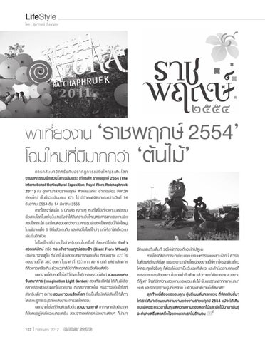 การกลั บ มาอี ก ครั้ ง กั บ ปรากฏการณ ยิ่ ง ใหญ ร ะดั บ โลก งานมหกรรมพืชสวนโลกเฉลิมพระ เกียรติฯ ราชพฤกษ 2554 (The International Horticultural Exposition: Royal Flora Ratchaphruek 2011) ณ อุทยานหลวงราชพฤกษ ตําบลแมเหียะ อําเภอเมือง จังหวัด เชียงใหม พื้นที่รวมประมาณ 470 ไร มีกําหนดจัดงานระหวางวันที่ 14 ธันวาคม 2554 ถึง 14 มีนาคม 2555 หากใครจําไดเมอ 5 ปที่แลว หลายๆ คนที่ ไดไปเที่ยวงานมหกรรม พืชสวนโลกในครั้งนั้น คงยังจําไดถึงความยิ่งใหญตระการตาของงานพืช สวนโลกกันได และก็คงตองบอกวางานมหกรรมพืชสวนโลกครัง้ นีก้ ย็ ิง่ ใหญ ไมแพงานเมอ 5 ปที่แลวเชนกัน และยังมีไฮไลทใหมๆ มาใหเราไดเที่ยวชม เพิ่มขึ้นอีกดวย ไฮไลทใหมที่นาสนใจสําหรับงานในครั้งนี้ ก็คงหนีไมพน ชิงชา สวรรคยักษ หรือ กระเชาราชพฤกษลอยฟา (Giant Flora Wheel) นําเขามาจากดูไบ ที่เมอขึ้นไปแลวจะสามารถมองเห็น ทัศนียภาพ 470 ไร ของงานนี้ ได 360 องศา ในราคาที่ 120 บาท ตอ 6 นาที แตนาเสียดาย ที่คิวยาวเหลือเกิน ดวยเวลาที่มีจํากัดชาวคณะจึงตองตัดใจ นอกจากนีย้ งั คงมีไฮไลททีน่ า สนใจอีกหลายสวนไดแก สวนแสงแหง จินตนาการ (Imagination Light Garden) สวนที่จะเปดไฟ ใหเห็นผีเสื้อ หลายรอยตัวและดอกไมสวยงาม ที่เกิดจากดวงไฟ หรือวาจะเปนไฮไลท สําหรับเด็กๆ อยาง สวนเยาวชนรักษโลก ซึ่งเปนสอมัลติมีเดียที่ ใหเด็กๆ ไดเรียนรูการอนุรักษพลังงาน การลดโลกรอน นอกจากไฮไลทขา งตนแลวนัน้ สวนนานาชาติ จากหลายสิบประเทศ ก็ยังคงอยูใหเที่ยวชมครบครัน สวนจากองคกรหนวยงานตางๆ ก็นํามา