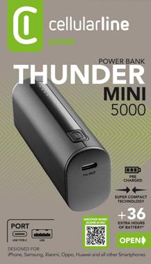 Thunder Mini Power Bank garanterer utmerket ytelse for nødlading av smarttelefoner, og gir opptil 12W strøm. Avhengig av telefonens størrelse gir laderen deg ca. 36 timer ekstra batteri. Den er utstyrt med USB-A og USB-C innganger for lading av laderen og for lading av enheten. Designet er utviklet for å gi den beste ytelsen, det sklisikre belegget og dekselet er laget av mykt materiale gir den et solid grep og gjør den behagelig å ta på. Litiumpolymerceller med høy tetthet garanterer en mindre størrelse og maksimal portabilitet for Power Bank