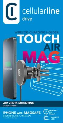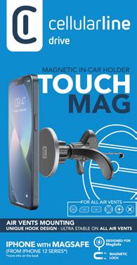 TOUCH MAG AIR VENTS er den magnetiske smarttelefonholderen i bilen designet spesielt for iPhones med MagSafe-system. Magnetene er designet for å holde en iPhone på plass og ikke forstyrre dens funksjoner Takket være den krokkoblingen festes Touch Mag Air Vents til alle luftventiler, både av standard og rund design.