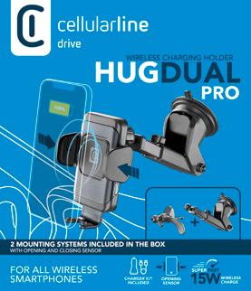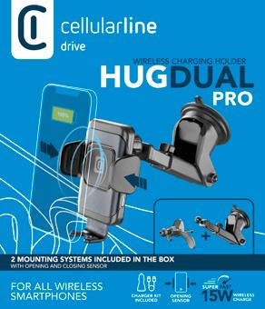 HUG AIR er en kombinert holder og trådløs lader til bilen. Wideactive™ 1-teknologi med enkeltspoleelektronikk sikrer effektiv og kontinuerlig trådløs lading uten å overopphete smarttelefonen. To forskjellige festesystemer er inkludert i pakken: en sugekopp for enkel feste av holderen til frontruten eller dashbordet og den innovative borrelåsfesten som kan festes til både standard og runde lufteventiler.