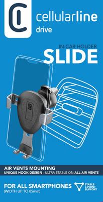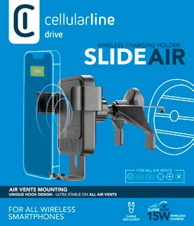 SLIDE AIR er den nye diskrete og brukervennlige Cellularlineholderen til bilen. Holder som gjør at du alltid kan ha telefonen innen rekkevidde mens du kjører, og lader den trådløst med opptil 15 W. Gjennom et enkelt innsettingssystem åpnes og lukkes holderen automatisk i takt med automatisk med vekten av smarttelefonen. Takket være det innovative krokfestet kan SLIDE AIR monteres på alle typer luftventiler på alle typer luftventiler, både standard og runde.