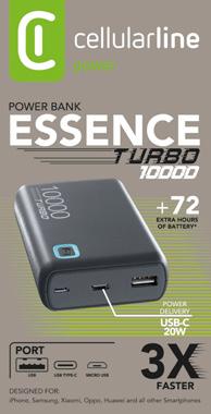 ESSENCE Turbo Power Bank garanterer utmerket ytelse for nødlading av smarttelefoner, og gir opptil 20W strøm. Avhengig av telefonens størrelse gir laderen deg ca. 72 timer ekstra batteri. Den er utstyrt med Micro USB og USB-C innganger for lading av laderen og en USB-A for lading av enheten. Designet er utviklet for å gi den beste ytelsen, det sklisikre belegget og dekselet er laget av mykt materiale gir den et solid grep og gjør den behagelig å ta på. Litiumpolymerceller med høy tetthet garanterer en mindre størrelse og maksimal portabilitet for Power Bank