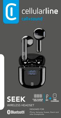 SEEK er et TWS Headset som får plass i lommen. Ladeesken lar deg lade Headsetet opptil 4 ganger for en total spilletid på 15 timer. LED-displayet på dekselet viser prosentandelen av gjenværende lading, og gir deg beskjed når du trenger å lade dekselet. Samtaler, musikk og volum styres direkte fra øretelefonene via berøringskontroller.
