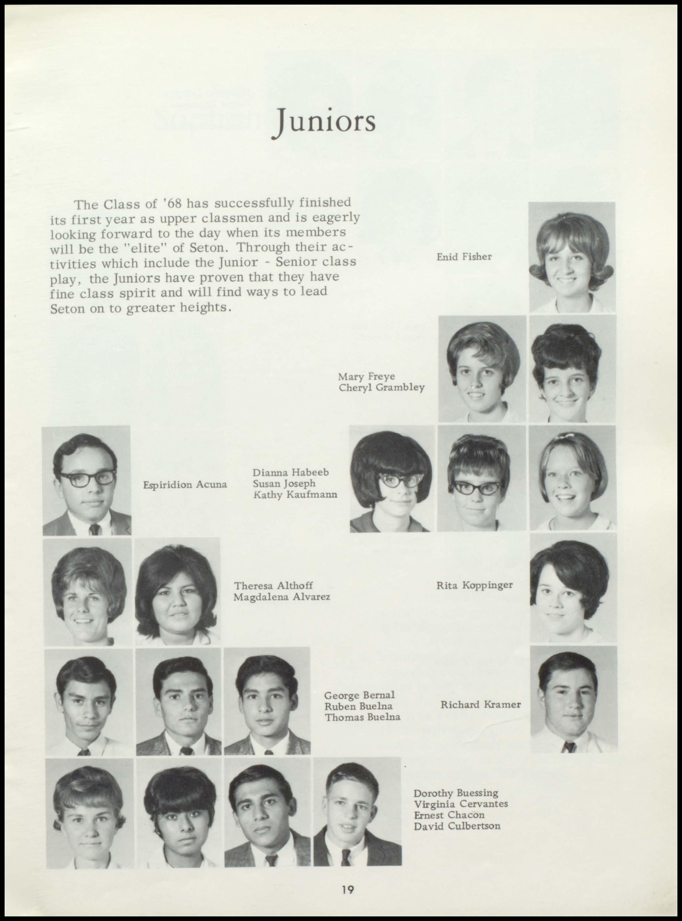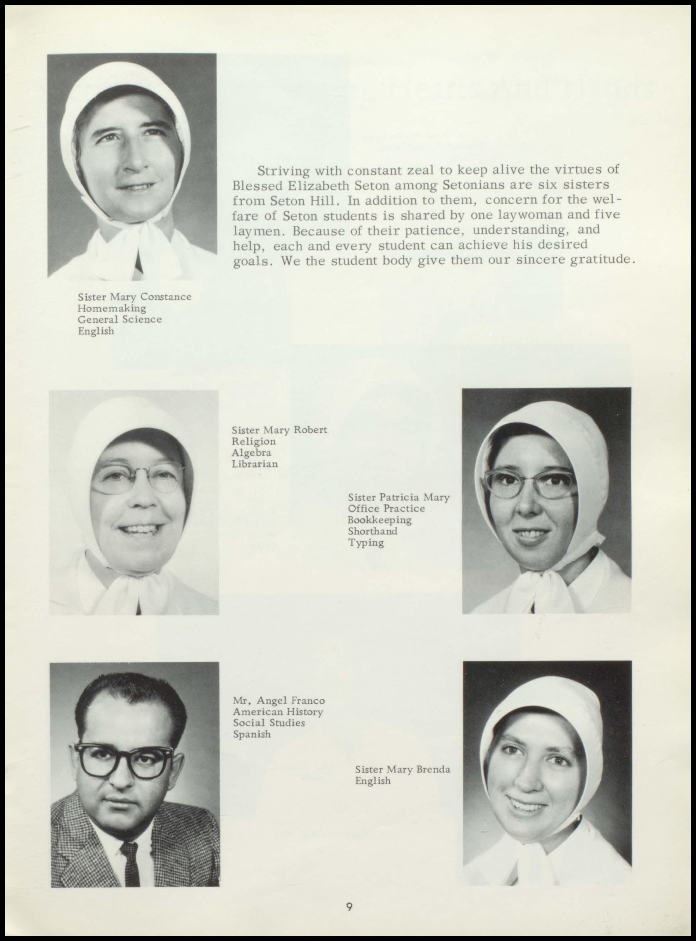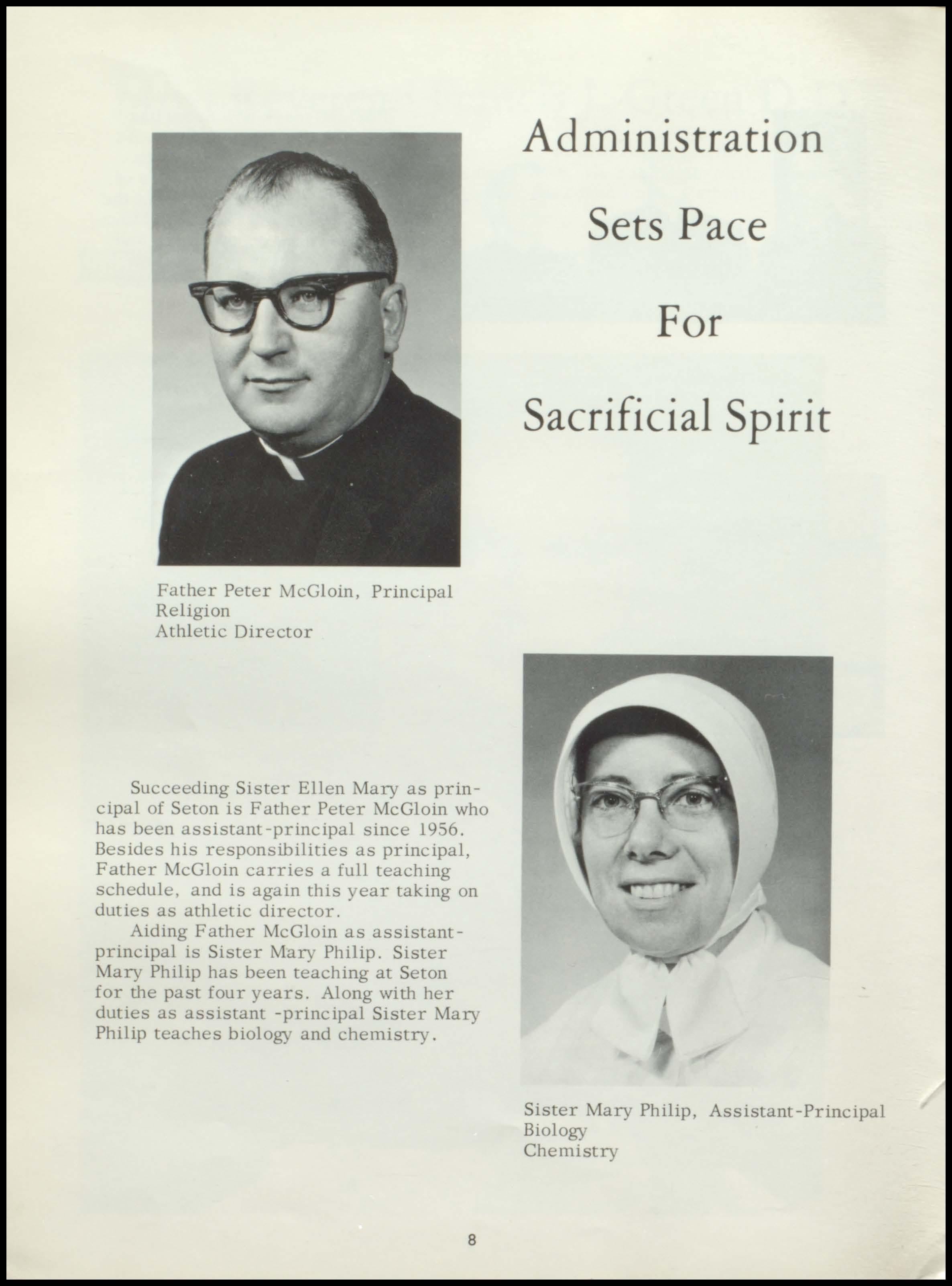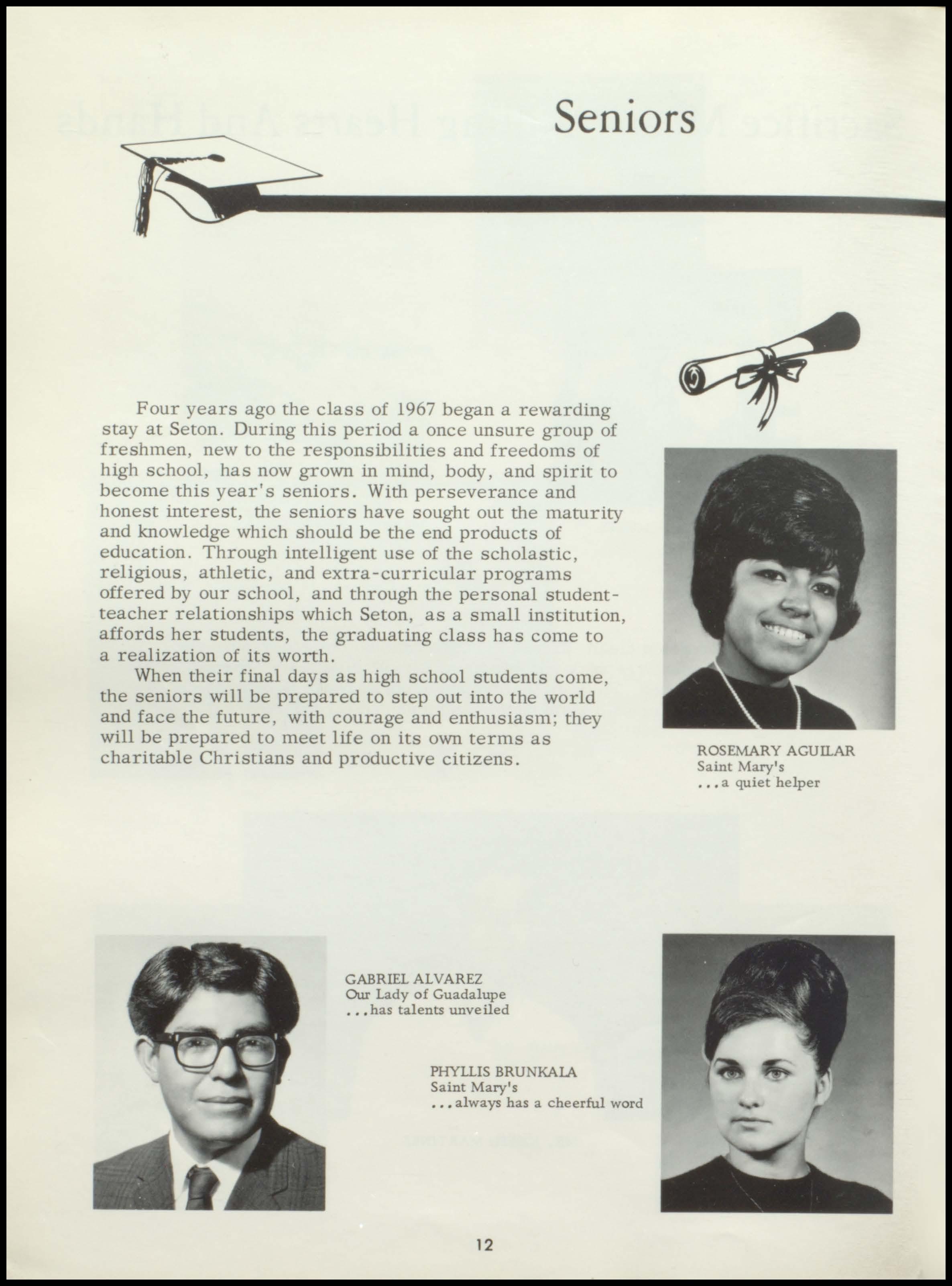 Four years ago the class of 1967 began a rewarding stay at Seton. During this period a once unsure group of freshmen, new to the responsibilities and freedoms of high school, has now grown in mind, body, and spirit to become this year's seniors. With perseverance and honest interest, the seniors have sought out the maturity and knowledge which should be the end products of education. Through intelligent use of the scholastic, religious, athletic, and extra- curricular programs offered by our school, and through the personal studentteacher relationships which Seton, as a small institution, affords her students, the graduating class has come to a realization of its worth