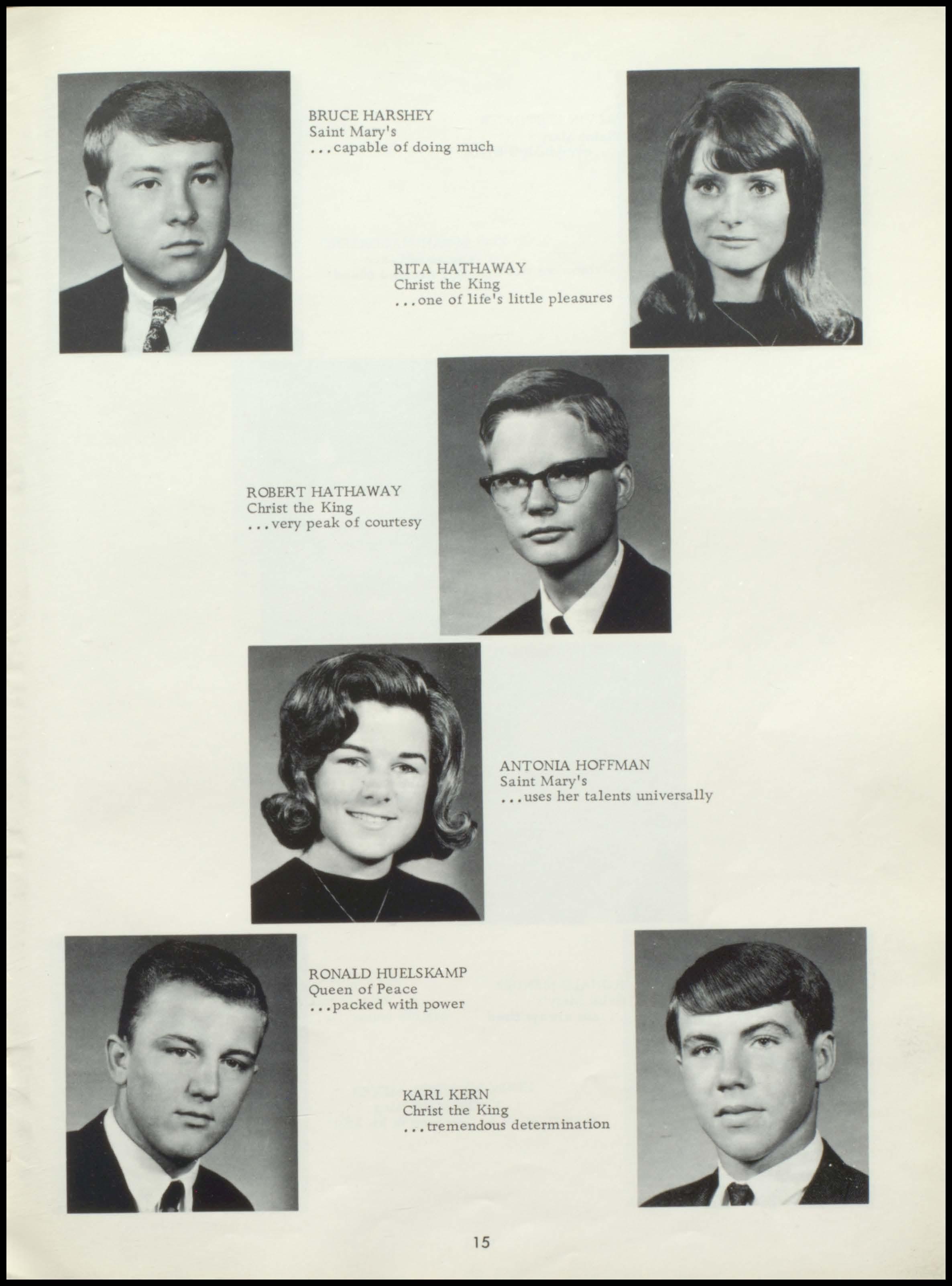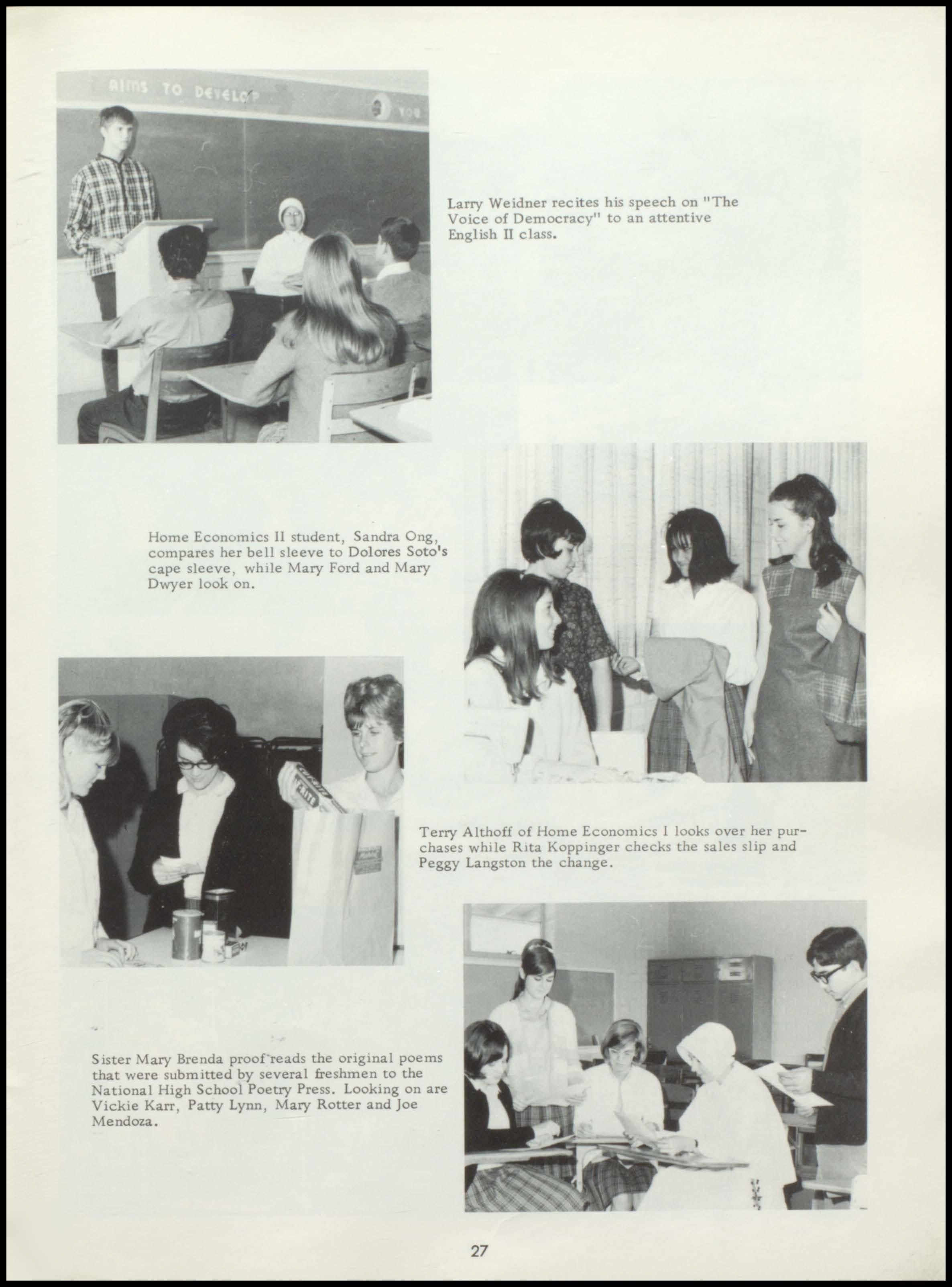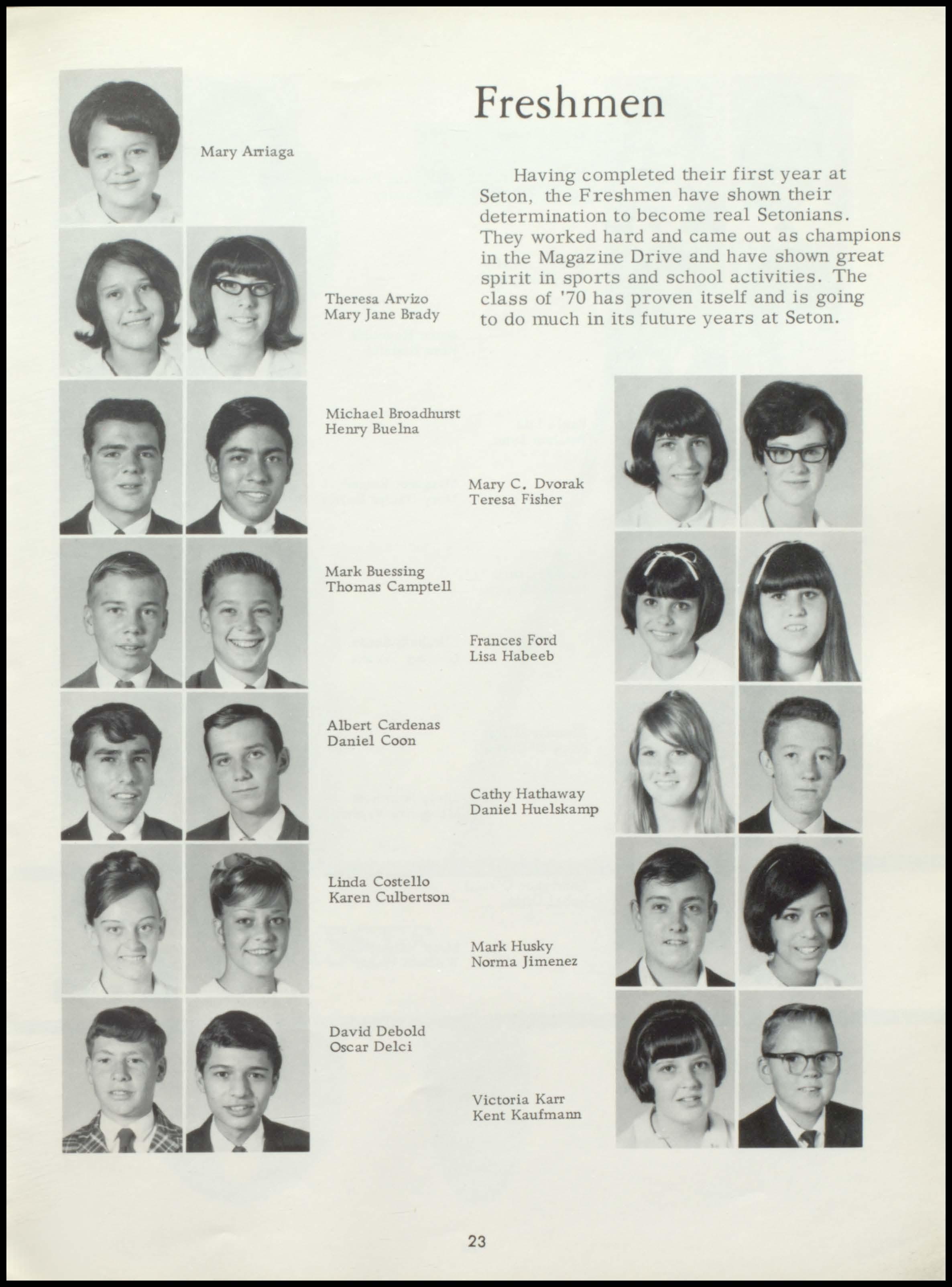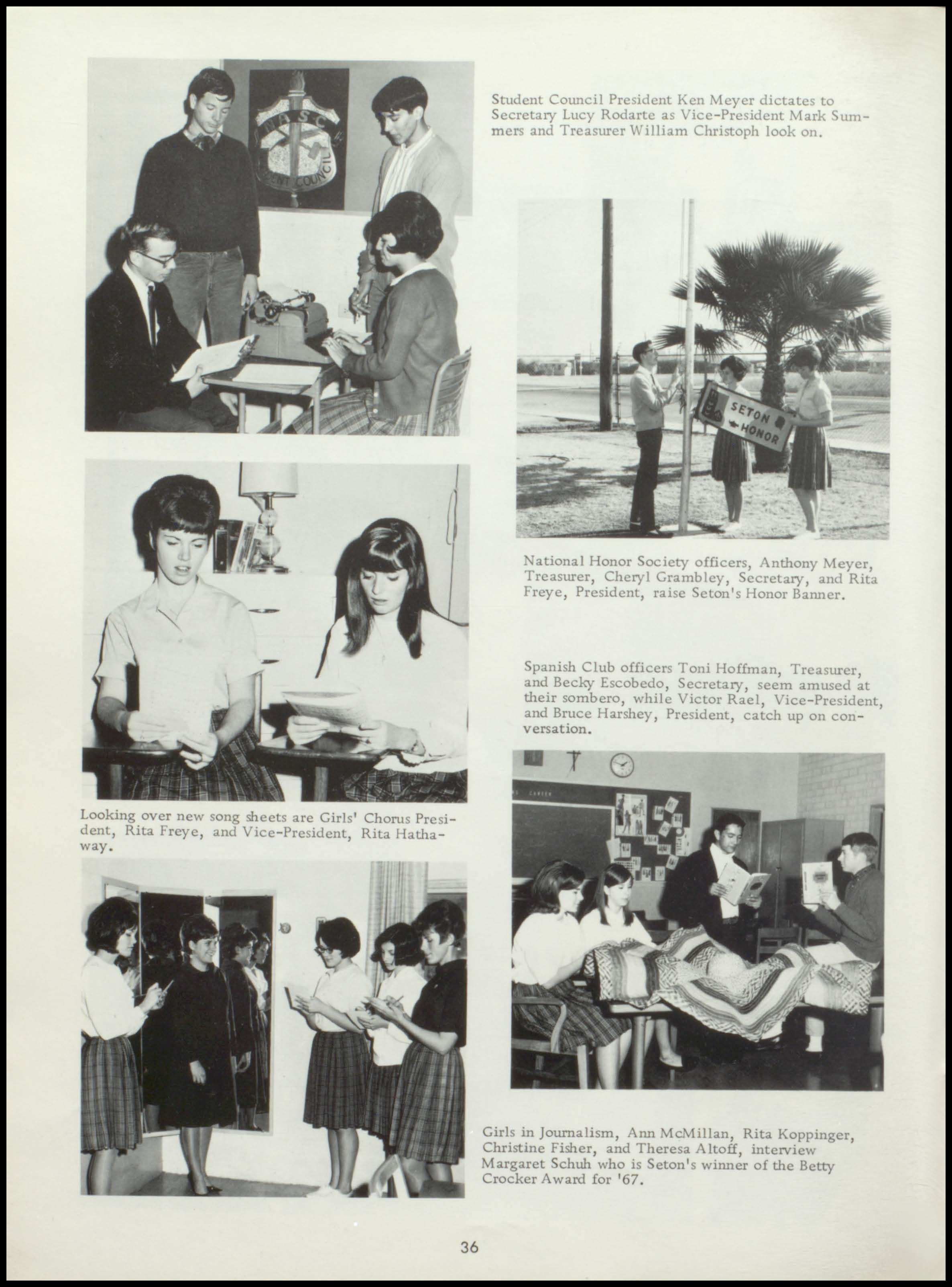 Four years ago the class of 1967 began a rewarding stay at Seton. During this period a once unsure group of freshmen, new to the responsibilities and freedoms of high school, has now grown in mind, body, and spirit to become this year's seniors. With perseverance and honest interest, the seniors have sought out the maturity and knowledge which should be the end products of education. Through intelligent use of the scholastic, religious, athletic, and extra- curricular programs offered by our school, and through the personal studentteacher relationships which Seton, as a small institution, affords her students, the graduating class has come to a realization of its worth