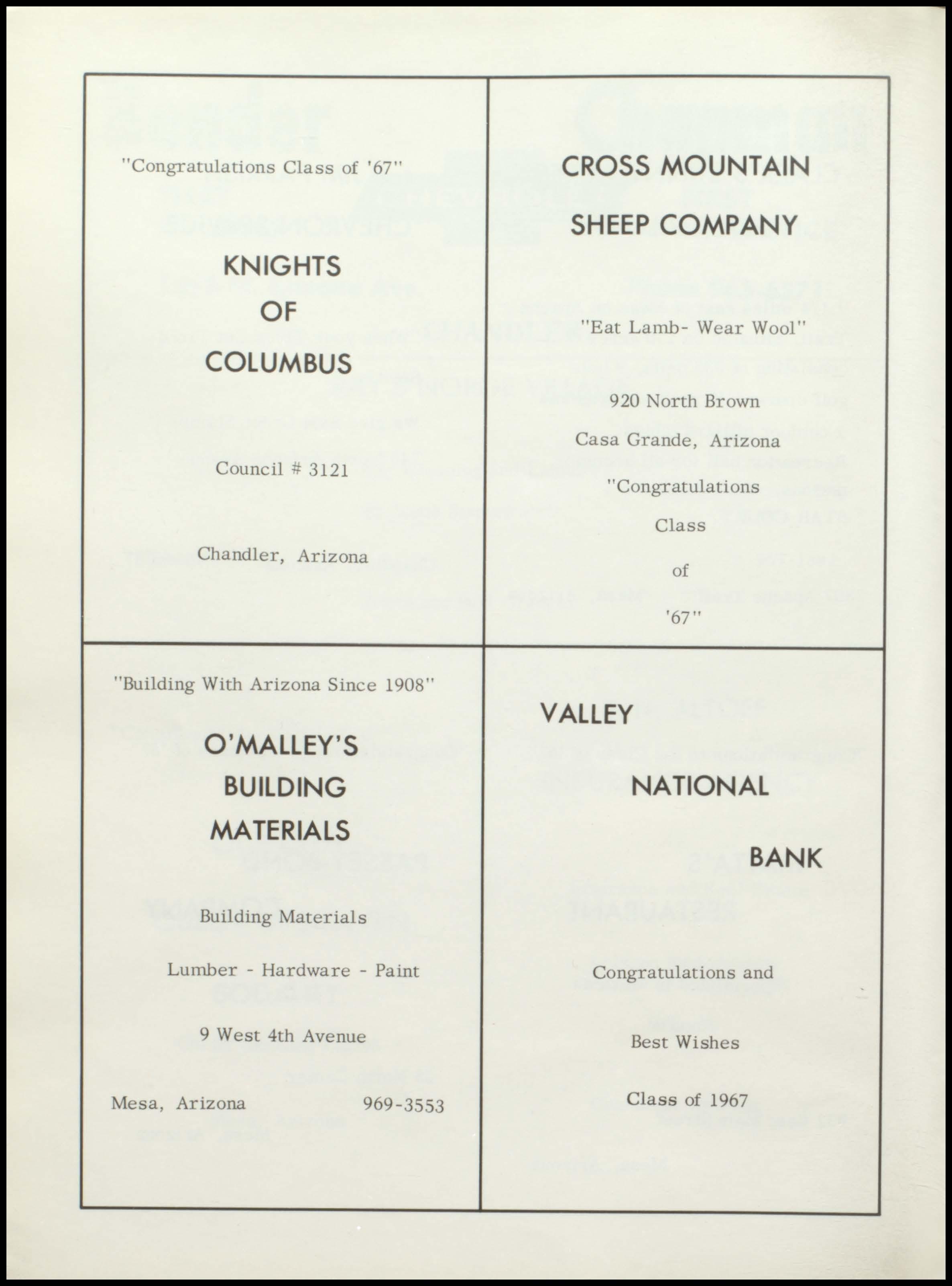 MOUNTAIN SHEEP COMPAN Y "Eat Lamb- Wear Wool" 920 North Brown Casa Grande, Arizona I I Congratulations Class of 1 67 !I VALLEY NATIONAL BANK