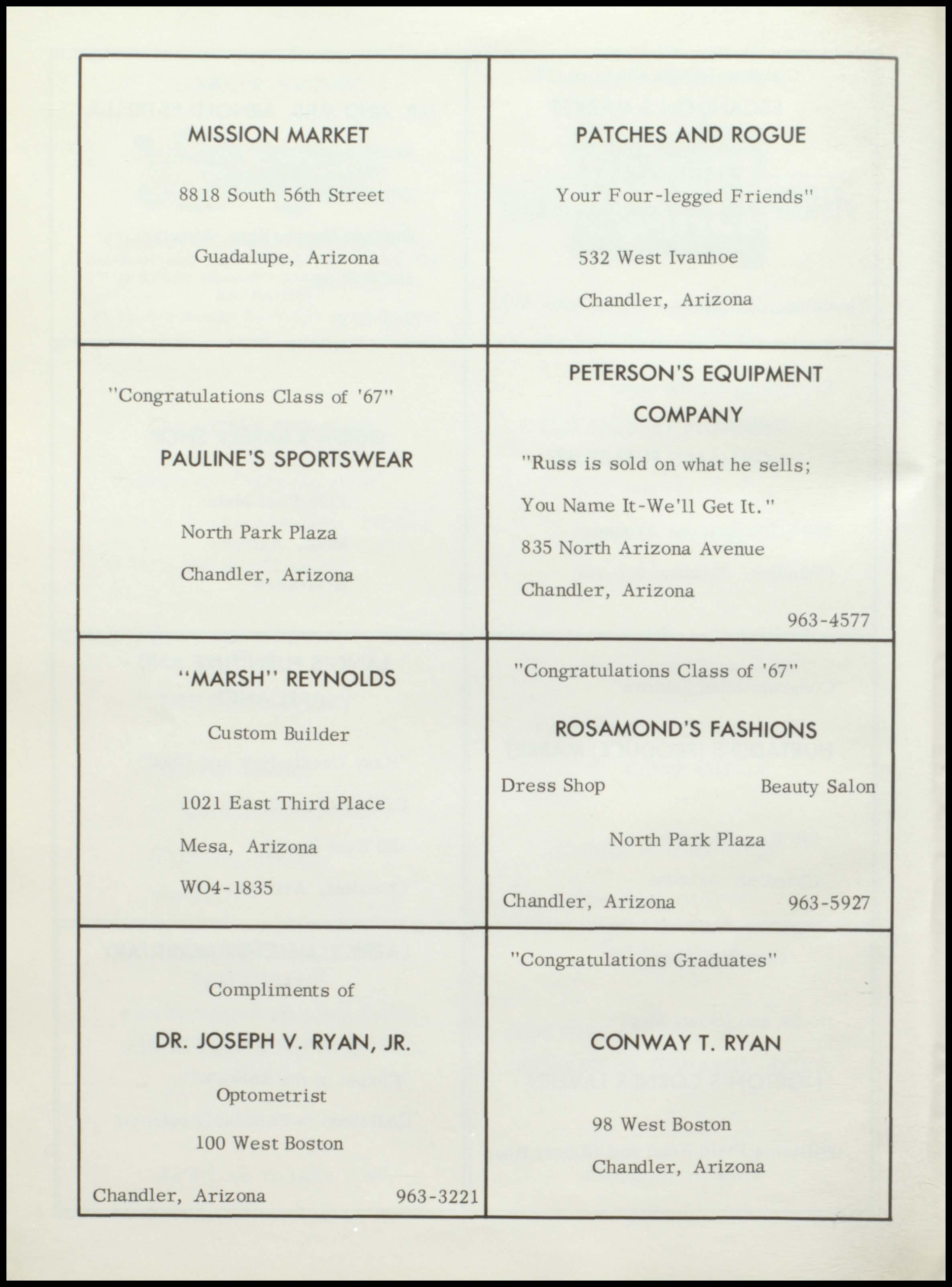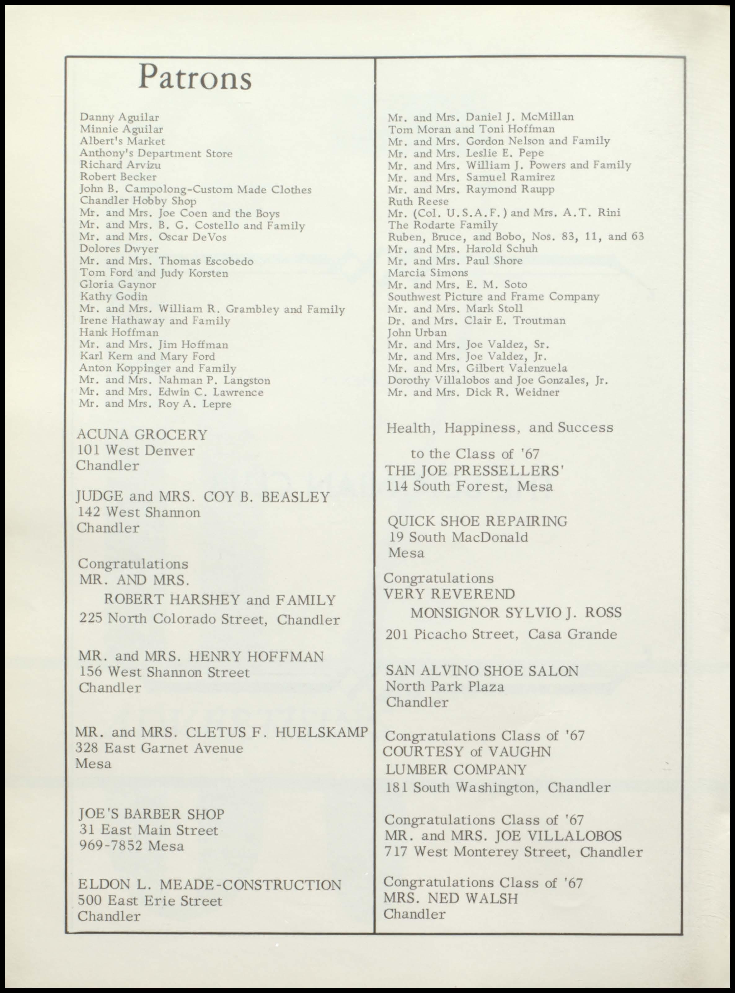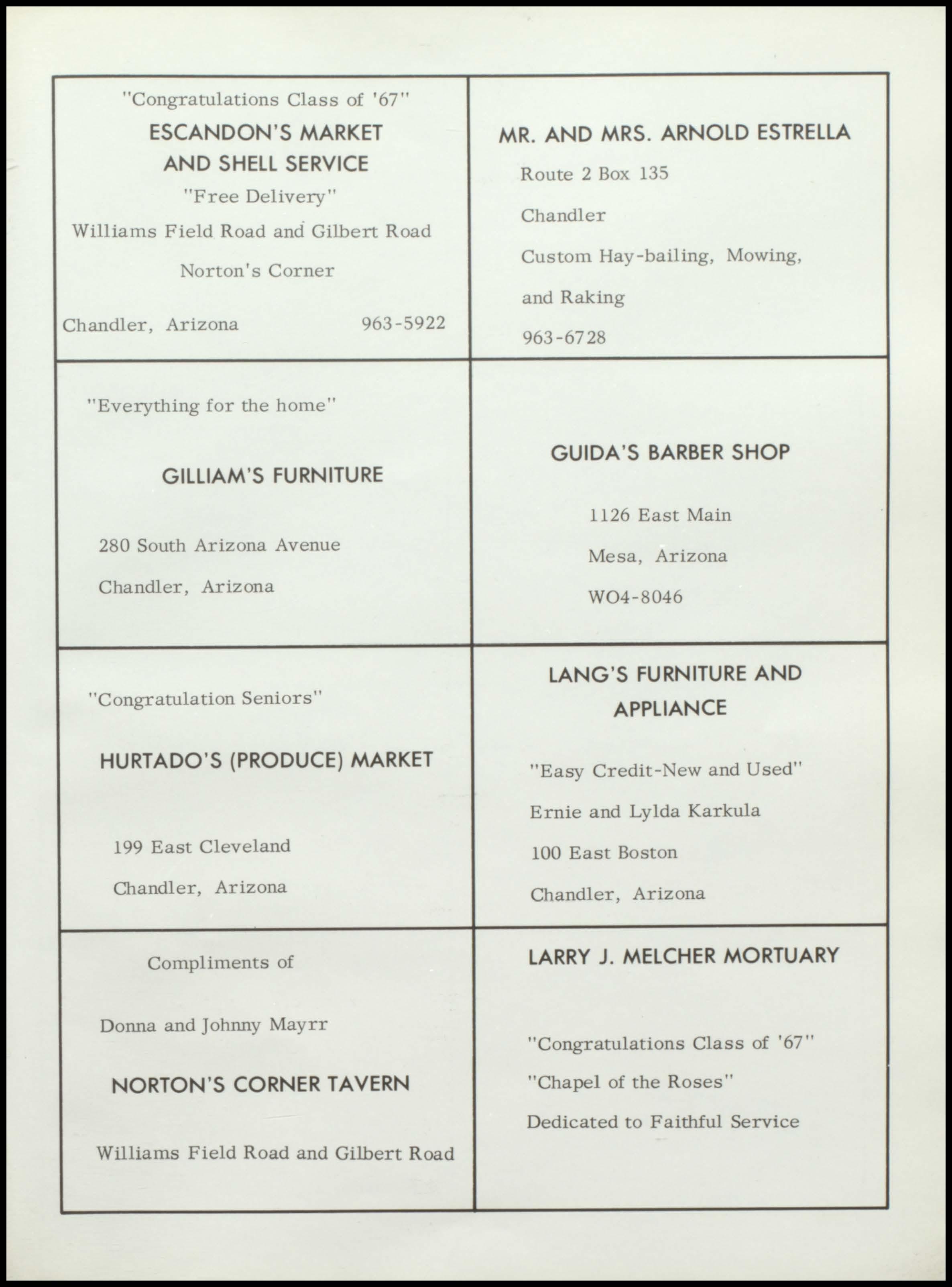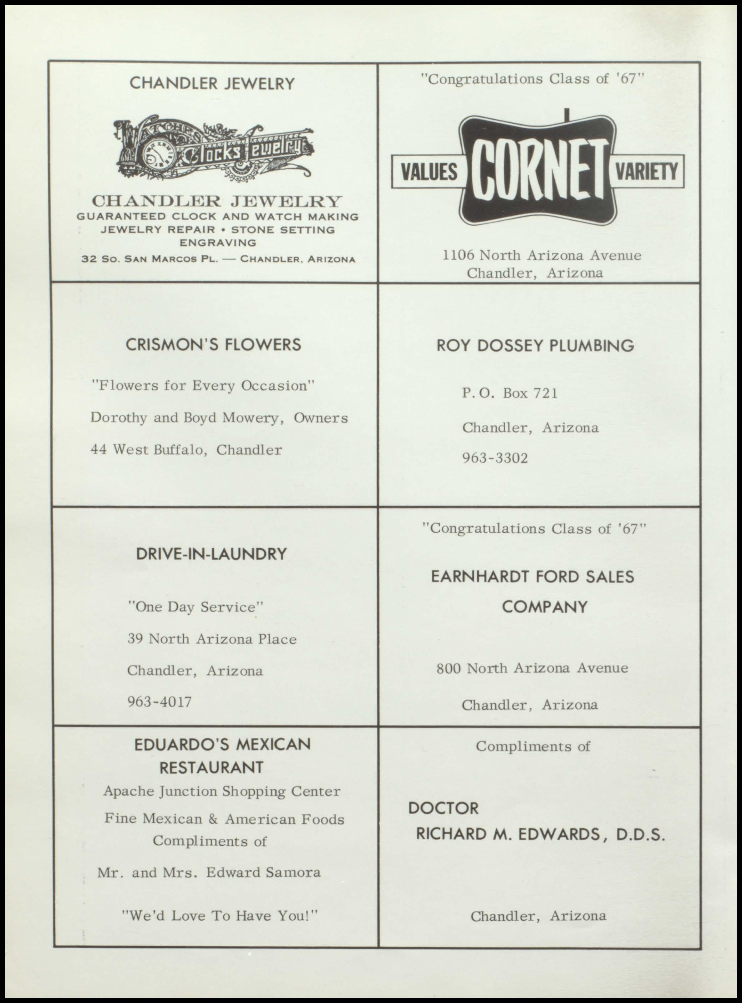 Bender Chapman FIRST FIRST IN SALES IN SERVICE 1375 N. Arizona Ave. Phone 963-6371 CHANDLER RAY'S NORGE VILLAGE Dry Cleaning and Laundry 62 North Stapley Mesa, Arizona 969-1881 Keith and Burl Granger R. H. ALTOFF "Congratulations Class of '67" INSURANCE AGENCY OUR LADY, Insurance and Real Estate QUEEN OF HEAYEN Arizona Bank Arcade SODALITY Suite 3 Christ the King Parish Mesa, Arizona Chandler, Arizona
