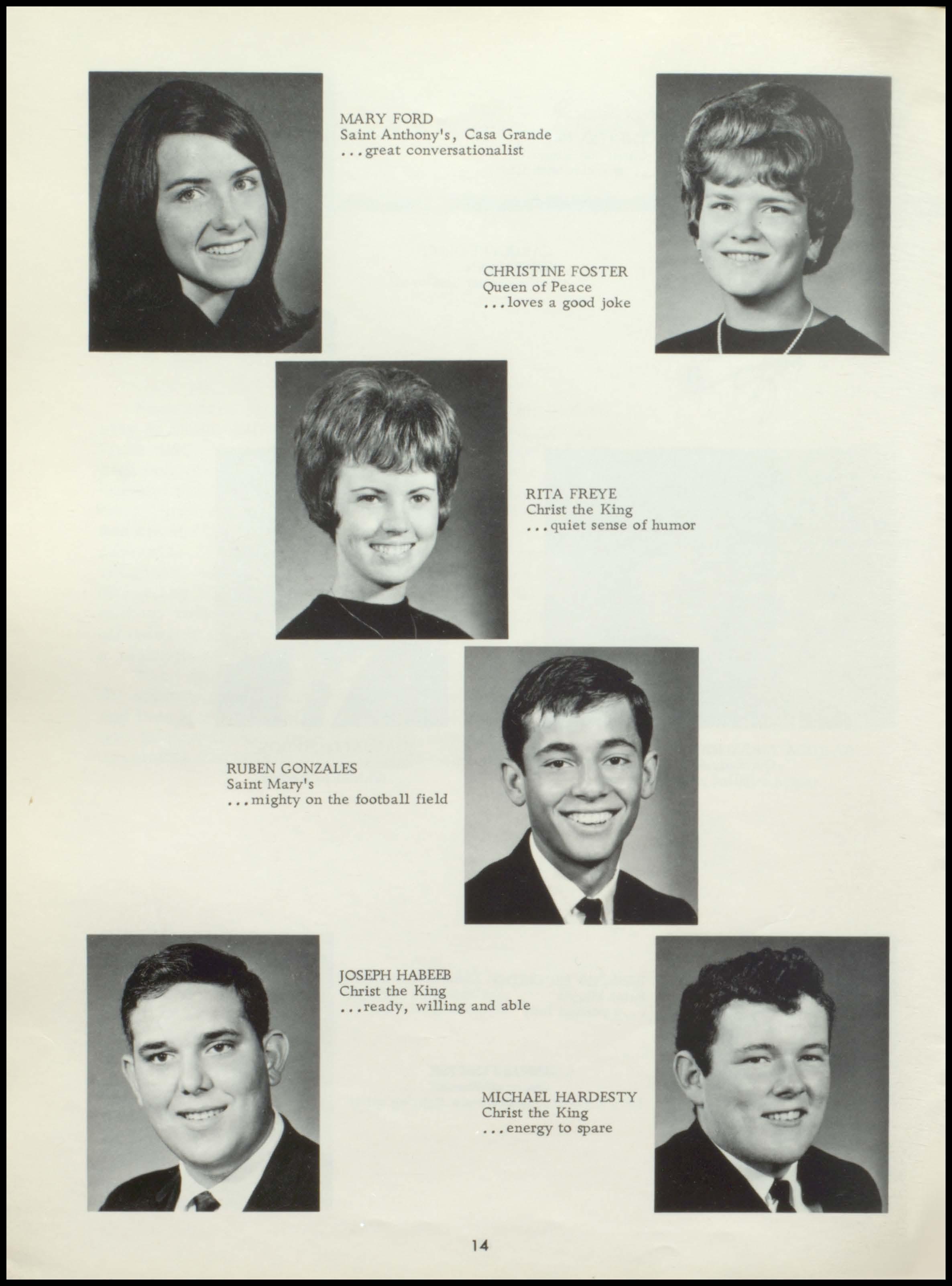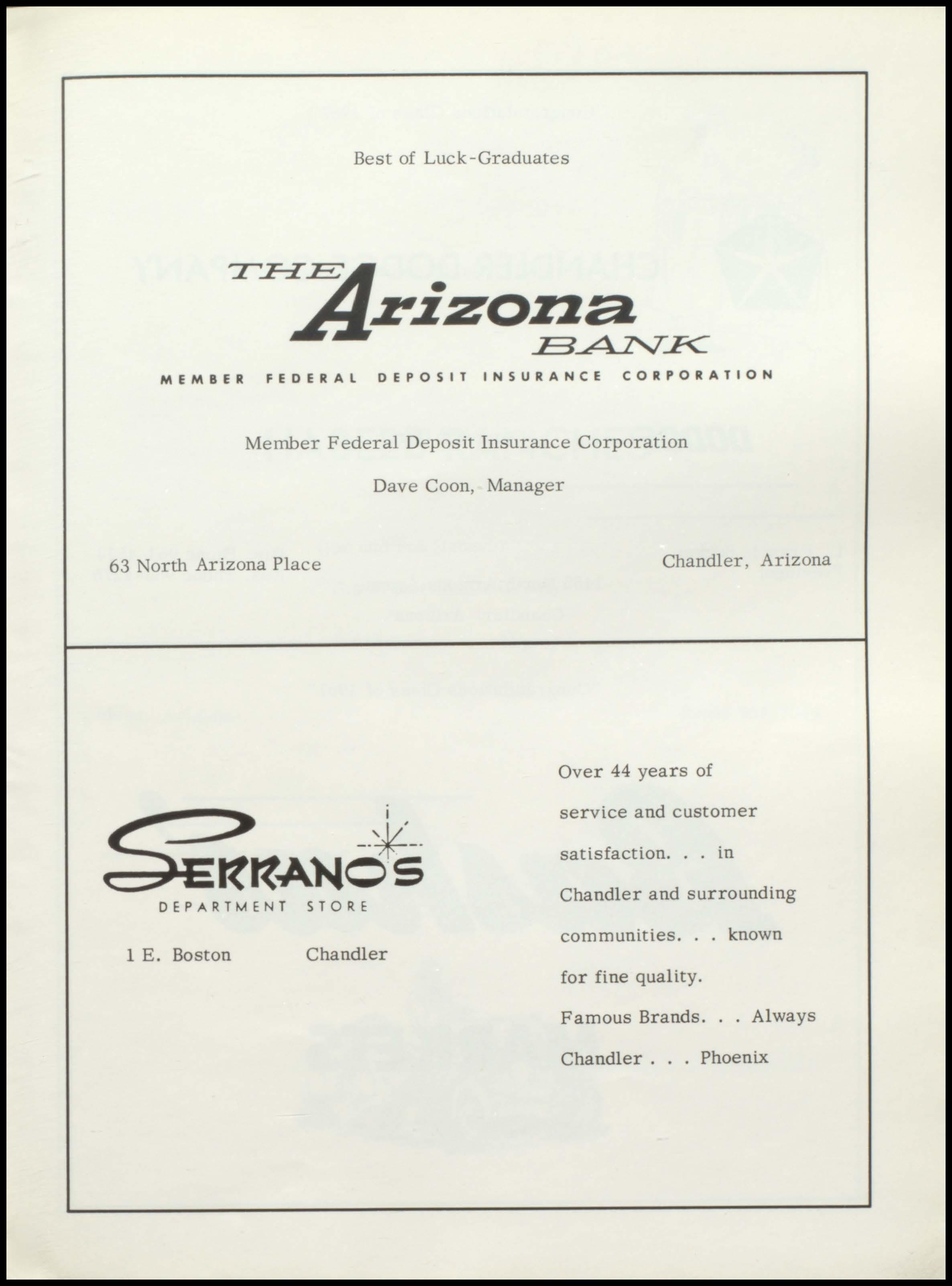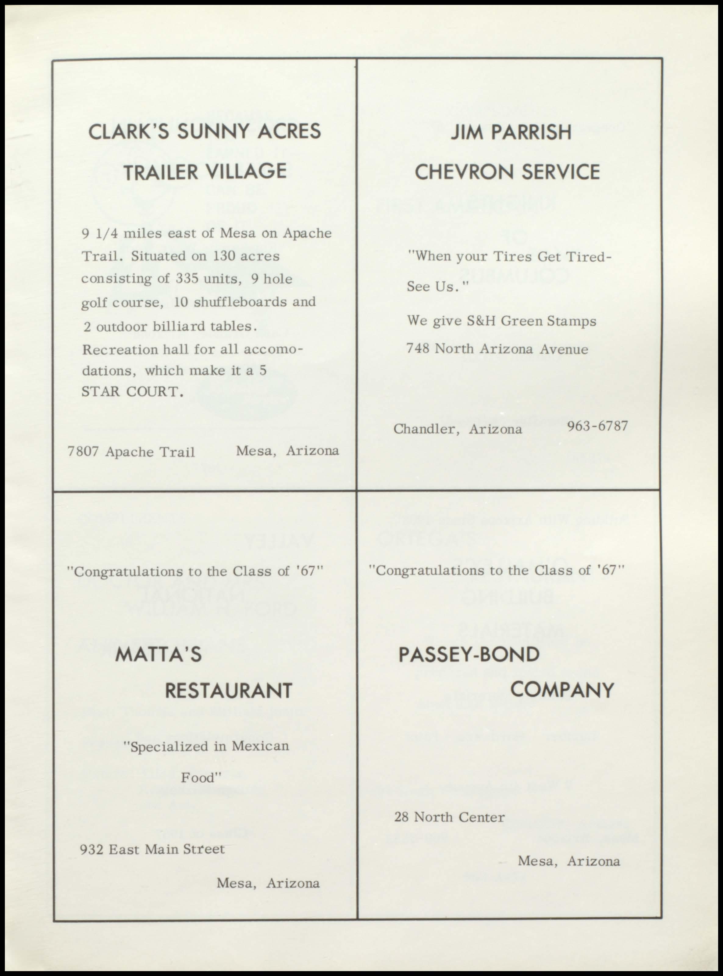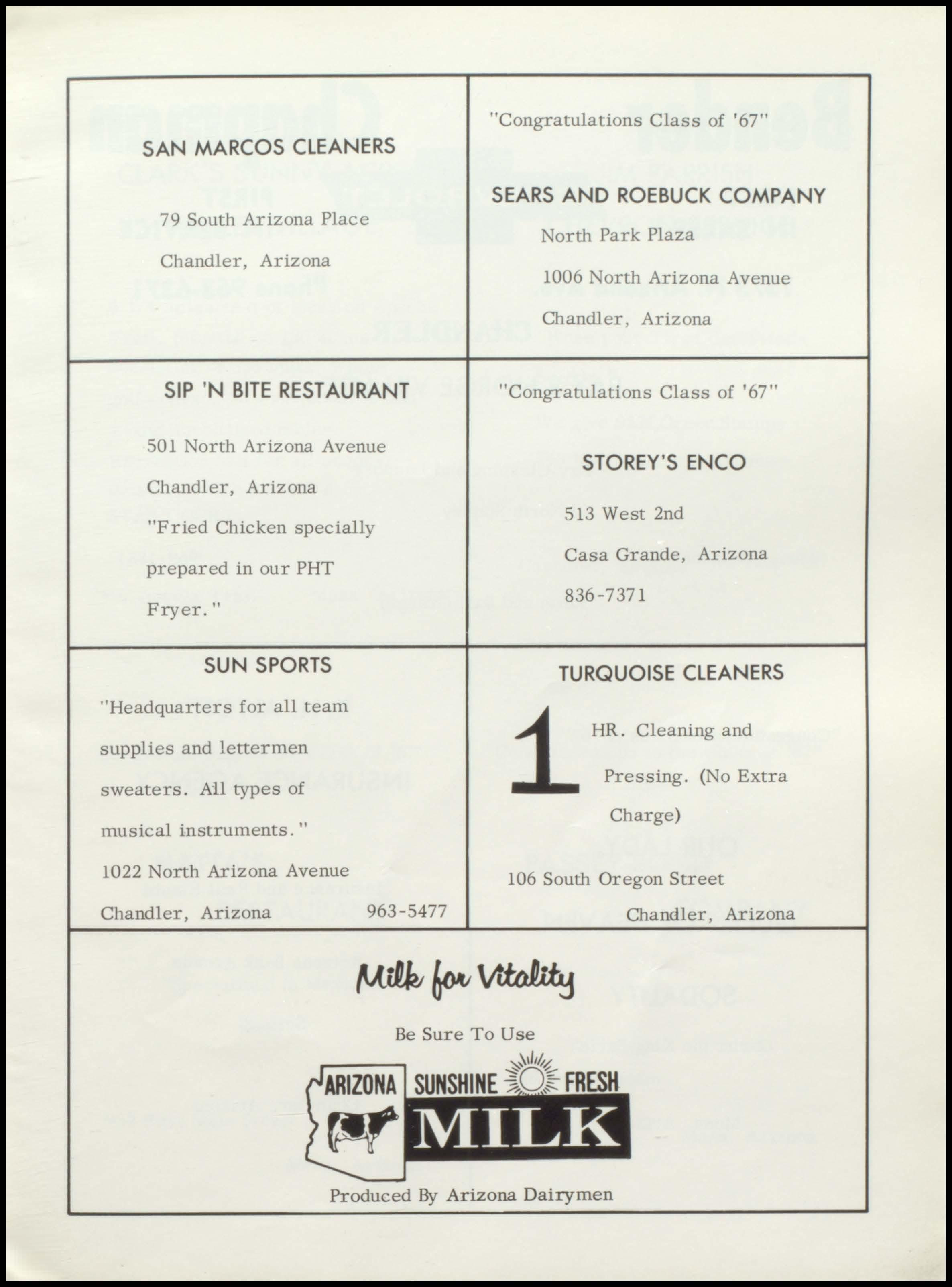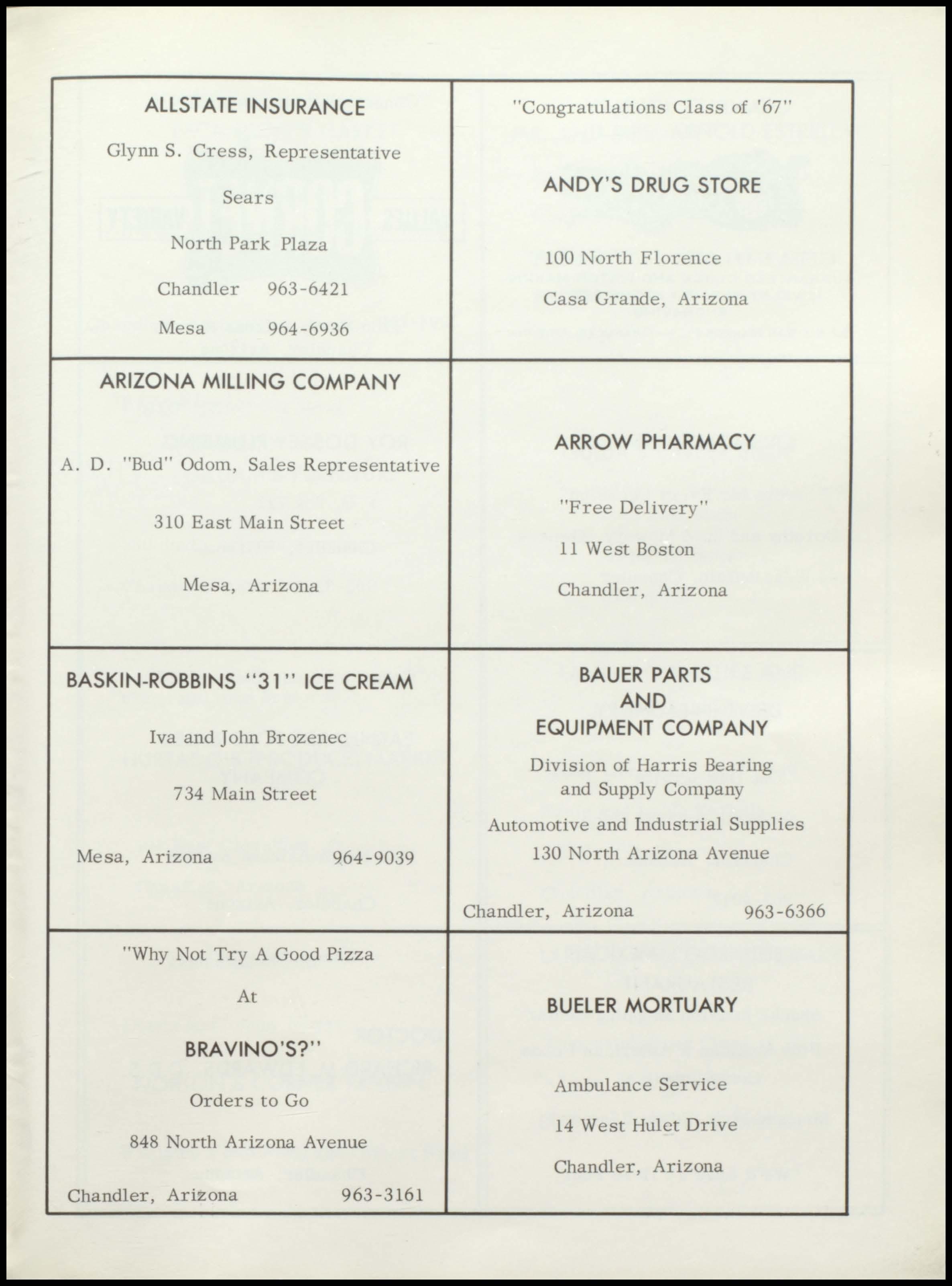 Bender Chapman FIRST FIRST IN SALES IN SERVICE 1375 N. Arizona Ave. Phone 963-6371 CHANDLER RAY'S NORGE VILLAGE Dry Cleaning and Laundry 62 North Stapley Mesa, Arizona 969-1881 Keith and Burl Granger R. H. ALTOFF "Congratulations Class of '67" INSURANCE AGENCY OUR LADY, Insurance and Real Estate QUEEN OF HEAYEN Arizona Bank Arcade SODALITY Suite 3 Christ the King Parish Mesa, Arizona Chandler, Arizona