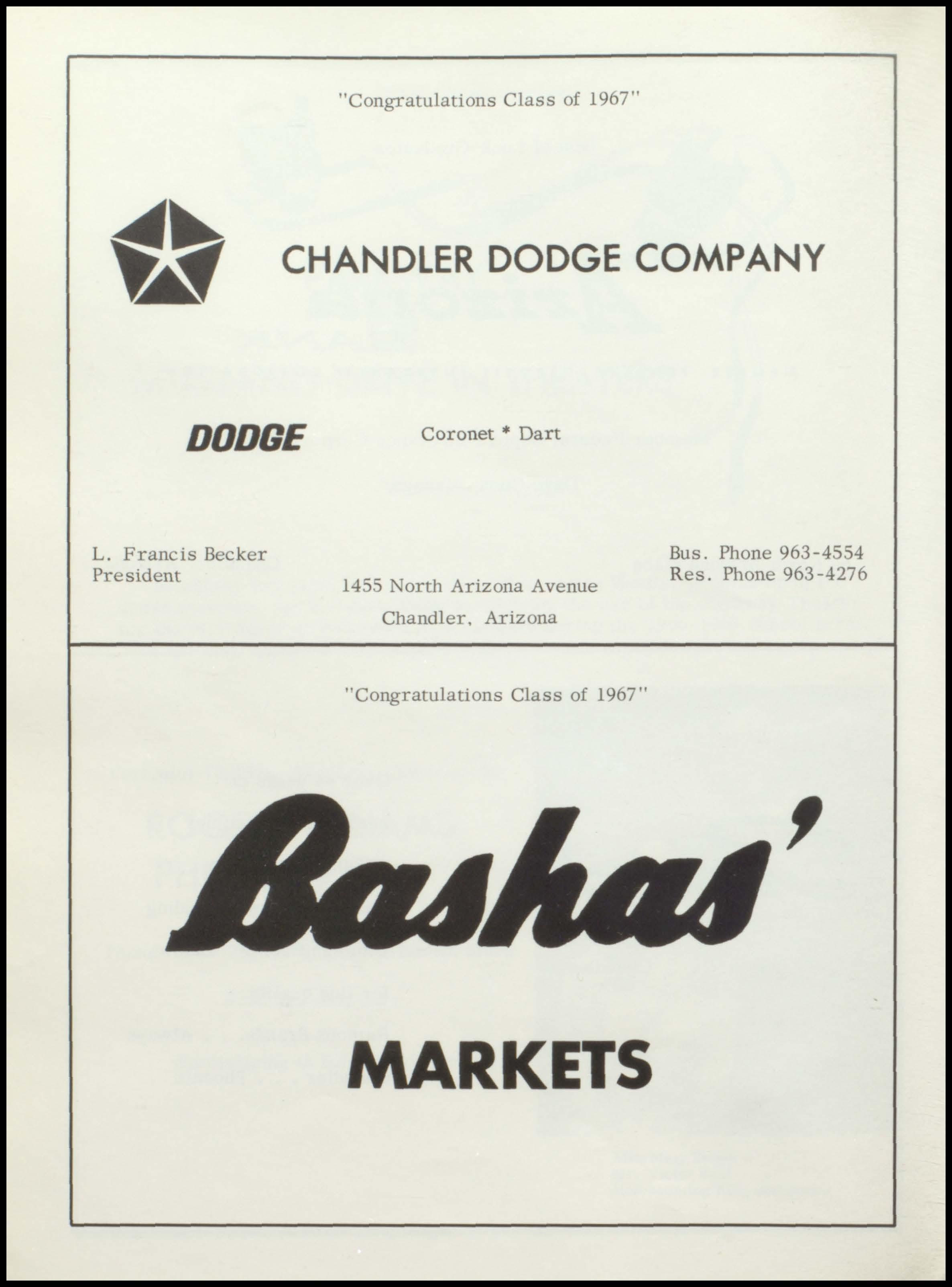 "Congratulations Class of 1967" CHANDLER DODGE COMPANY DODGE L. Francis Becker President Coronet* Dart 1455 North Arizona Avenue Chandler. Arizona "Congratulations Class of 1967"