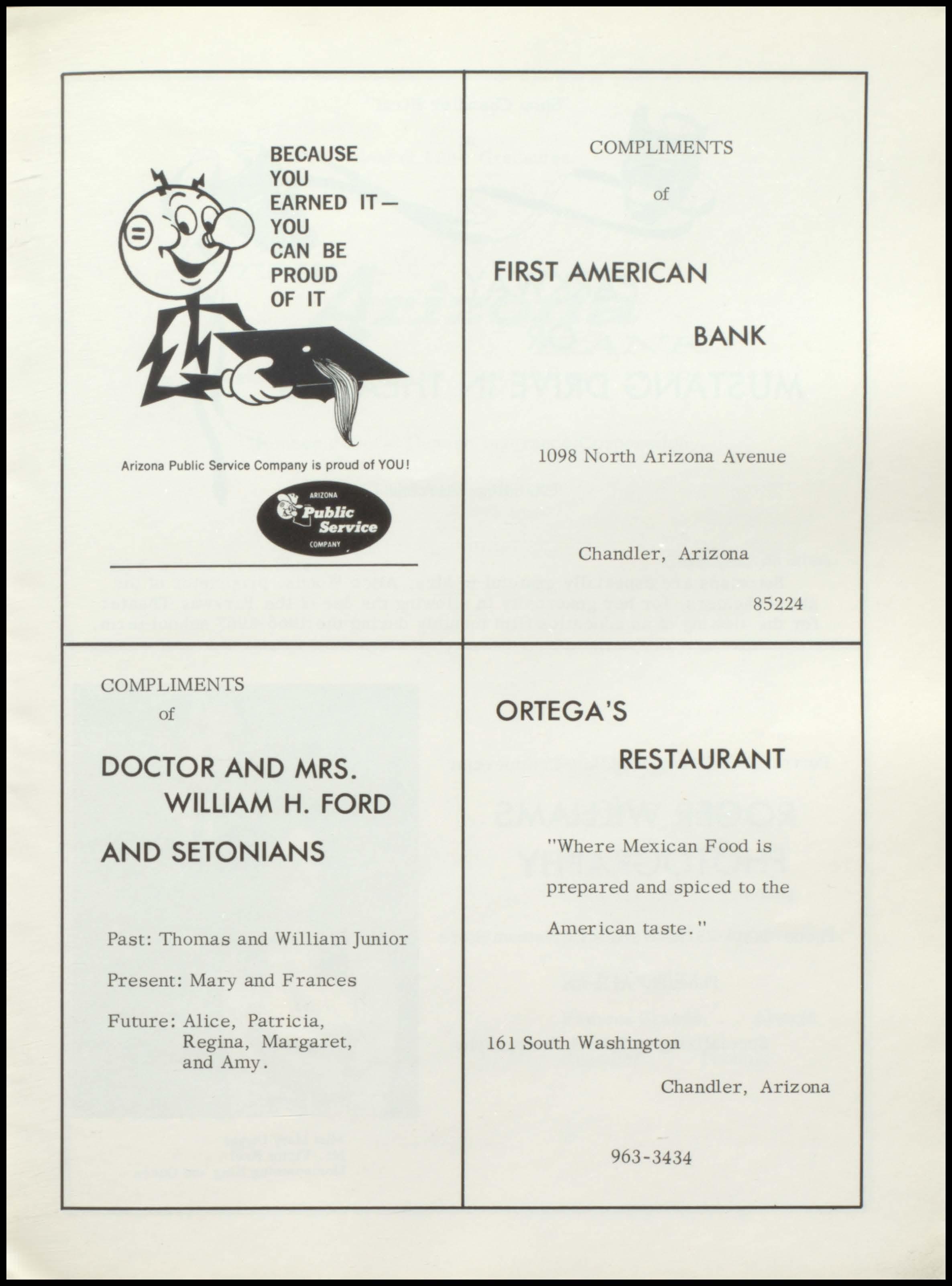 COMPLIMENTS of FIRST AMERICAN BANK 1098 North Arizona Avenue Chandler, Arizona 85224 ORTEGA'S RESTAURANT "Where Mexican Food is prepared and spiced to the American taste. " 161 South Washington Chandler, Arizona 963-3434