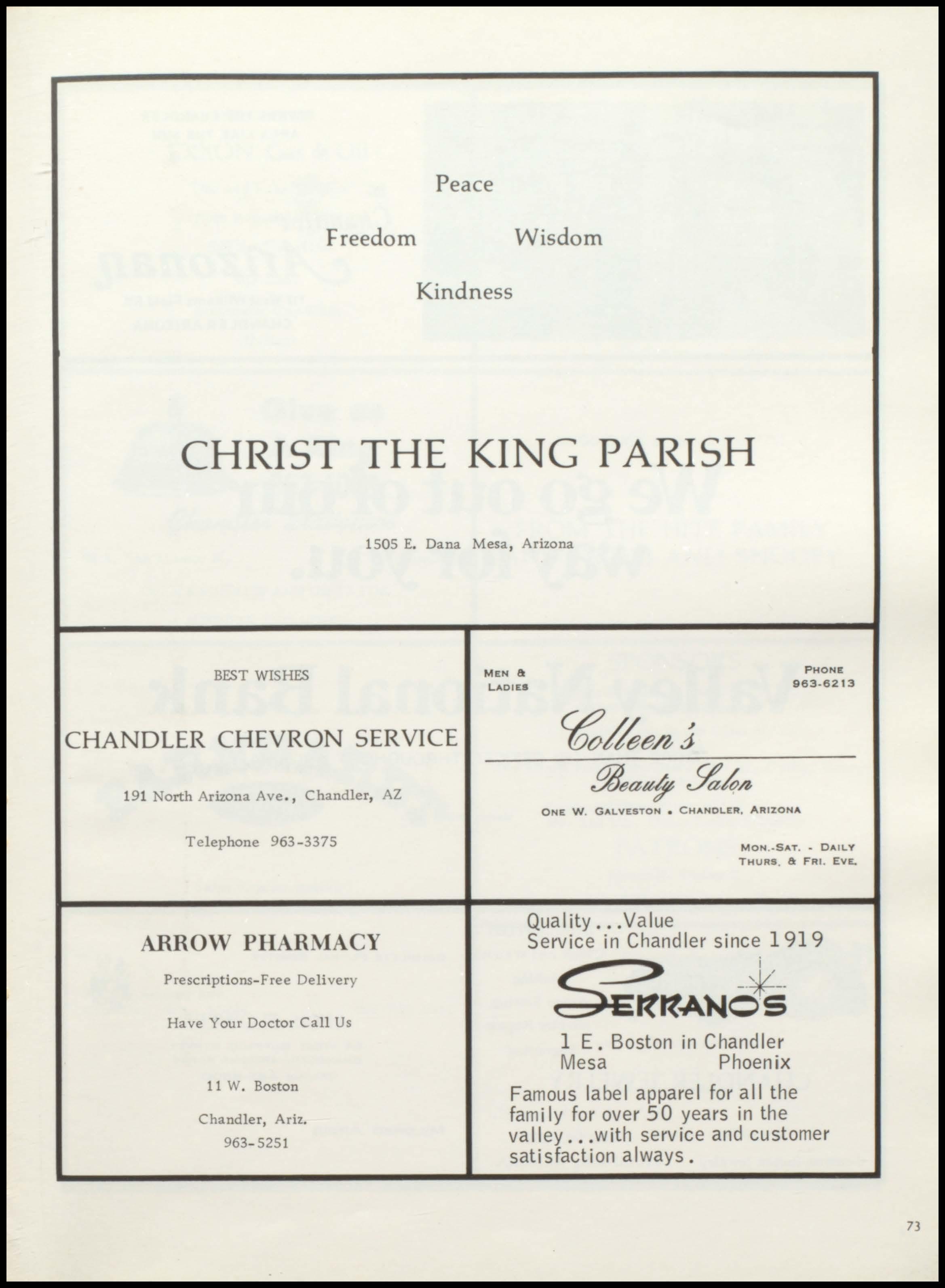 Peace Freedom Wisdom Kindness CHRIST THE KING PARISH 1505 E. Dana Mesa, Arizona BEST WISHES MEN 8: PHONE LADIES 963-6213 CHANDLER CHEVRON SERVICE 191 orth Arizona Ave., Chandler, AZ Ya/t;n ONE W GALVESTON • CHANDLER, ARIZONA Telephone 963-3375 MON -SAT. - DAILY THURS 8: FRI EVE. Quality ..• Value ARROW PHARMACY Service in Chandler since 1919 Prescriptions-Free Deli very Have Your Doctor Call Us 1 E. Boston in Chandler Mesa Phoenix 11 W. Boston Famous label apparel for all the Chandler, Ariz. fa mily for over 50 years in the 963-5251 valley .•. with service and customer satisfaction always. 73