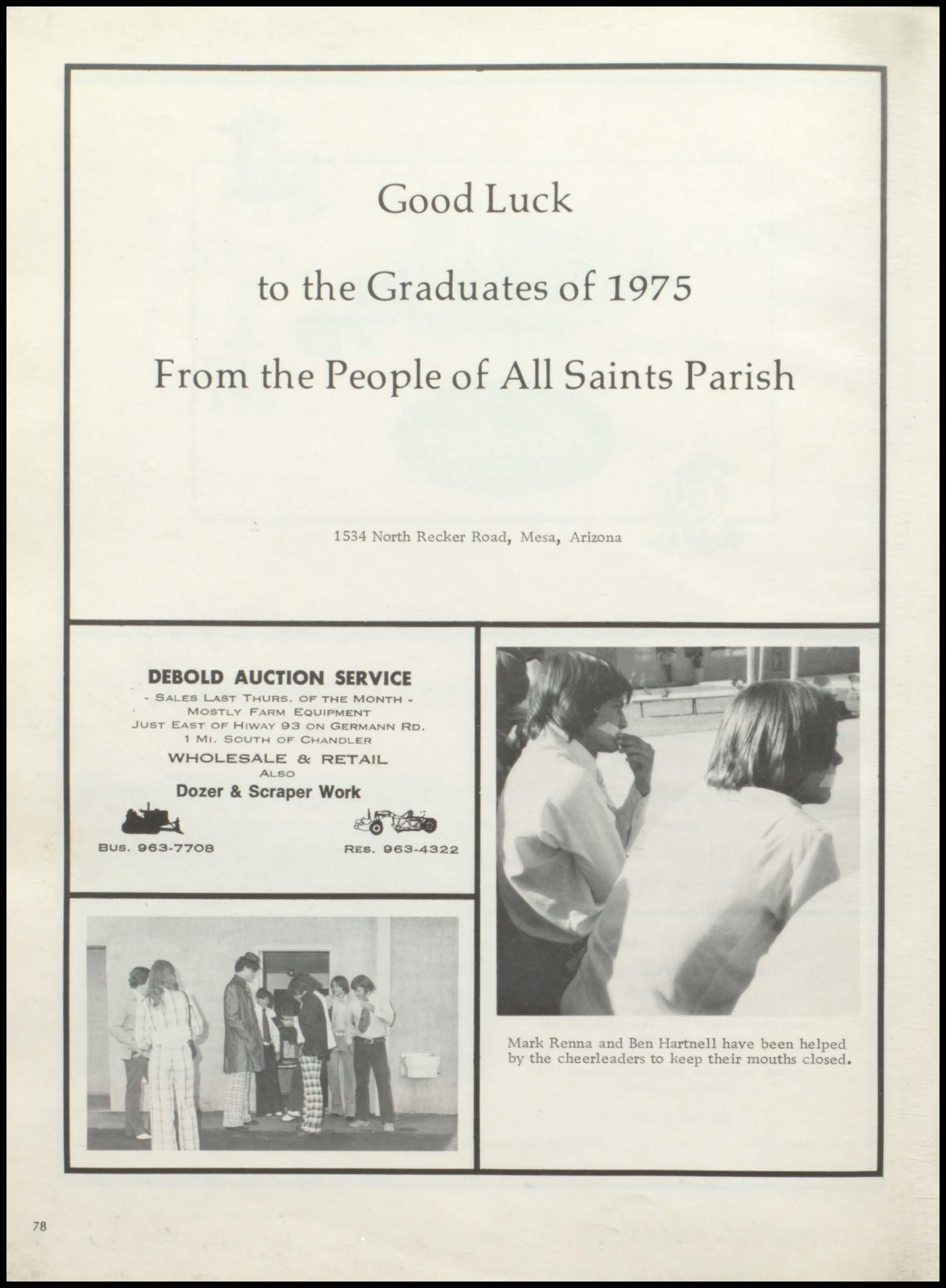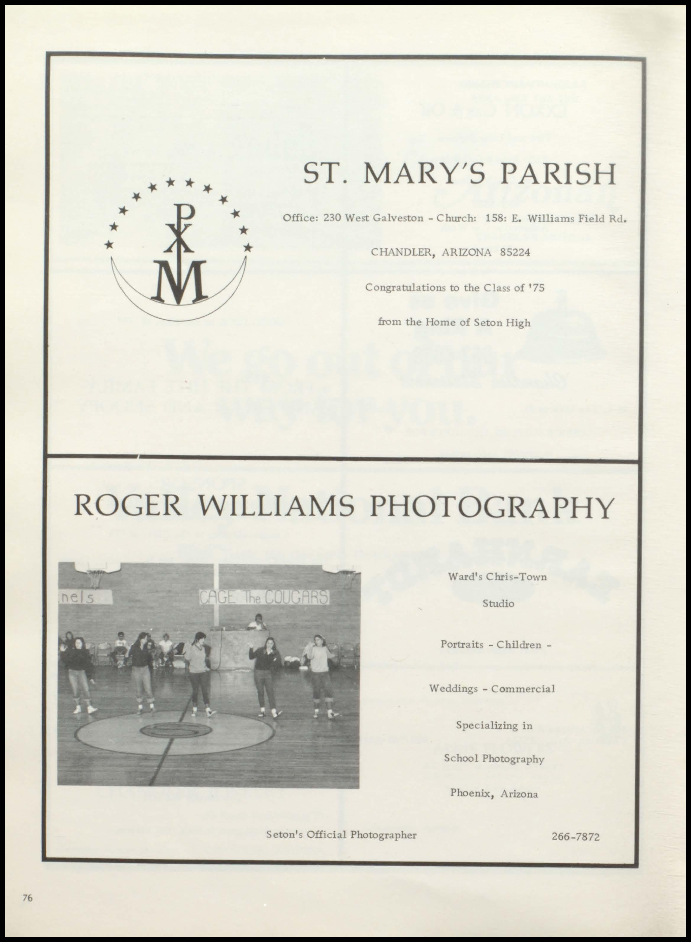 76 • ** ST. MARY'S PARISH Office: 230 West Galveston -Church: 158: E Williams Field Rd. CHANDLER, ARIZONA 85224 Congratulations to the Class of '75 from the Home of Seton High ROGER WILLIAMS PHOTOGRAPHY Ward's Chris-Town Studio Portraits -ChildrenWeddings -Commercial Specializing in School Photography Phoenix , Arizona Seton's Official Photographer 266-7872