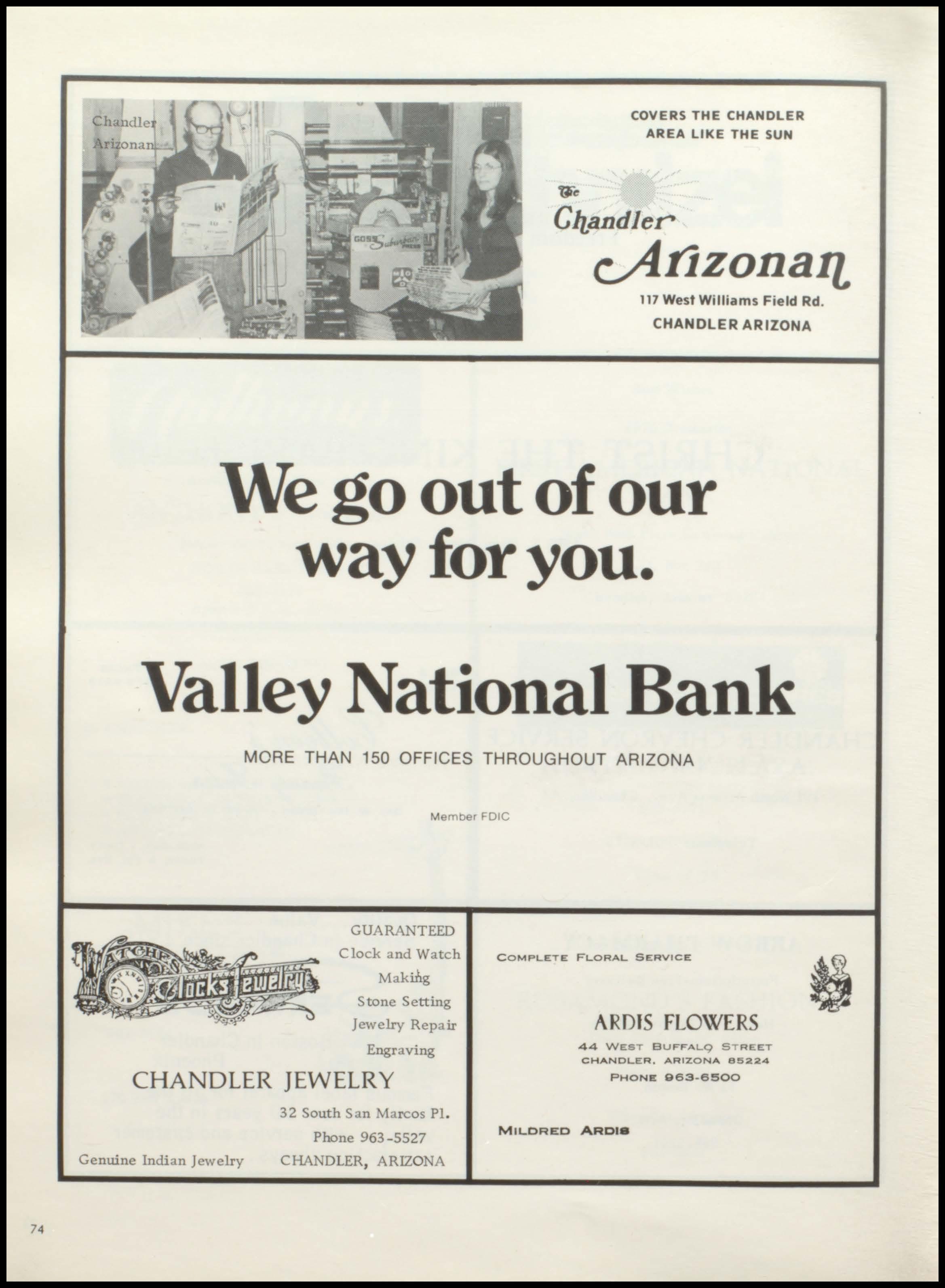 74 tJ"e COVERS THE CHANDL ER AREA LIKE THE SUN Cltandler cAI1zonaJl 117 West Williams F i eld Rd CHANDLER ARIZONA We go out of our wayforyou. Valley National Bank M O RE THAN 150 OFFICES THROUGHOUT ARIZONA Member FDIC GUARANTEED Clock and Watch Maki:b.g Stone Setting Jewelry Rep'lir Engraving C O M PLETE FLORAL SE R VICE ARDIS FLOWERS 4 4 WEST BUFFALQ C HAN DLE R , A R IZON A 85224 CHANDLER JEWELRY PHONE 9 6 3 -6 50 0 Genuine Indian Jewelry 32 South San Marcos Pl Phone 963 -5527 CHANDLER , ARIZONA MILDRED ARDJa