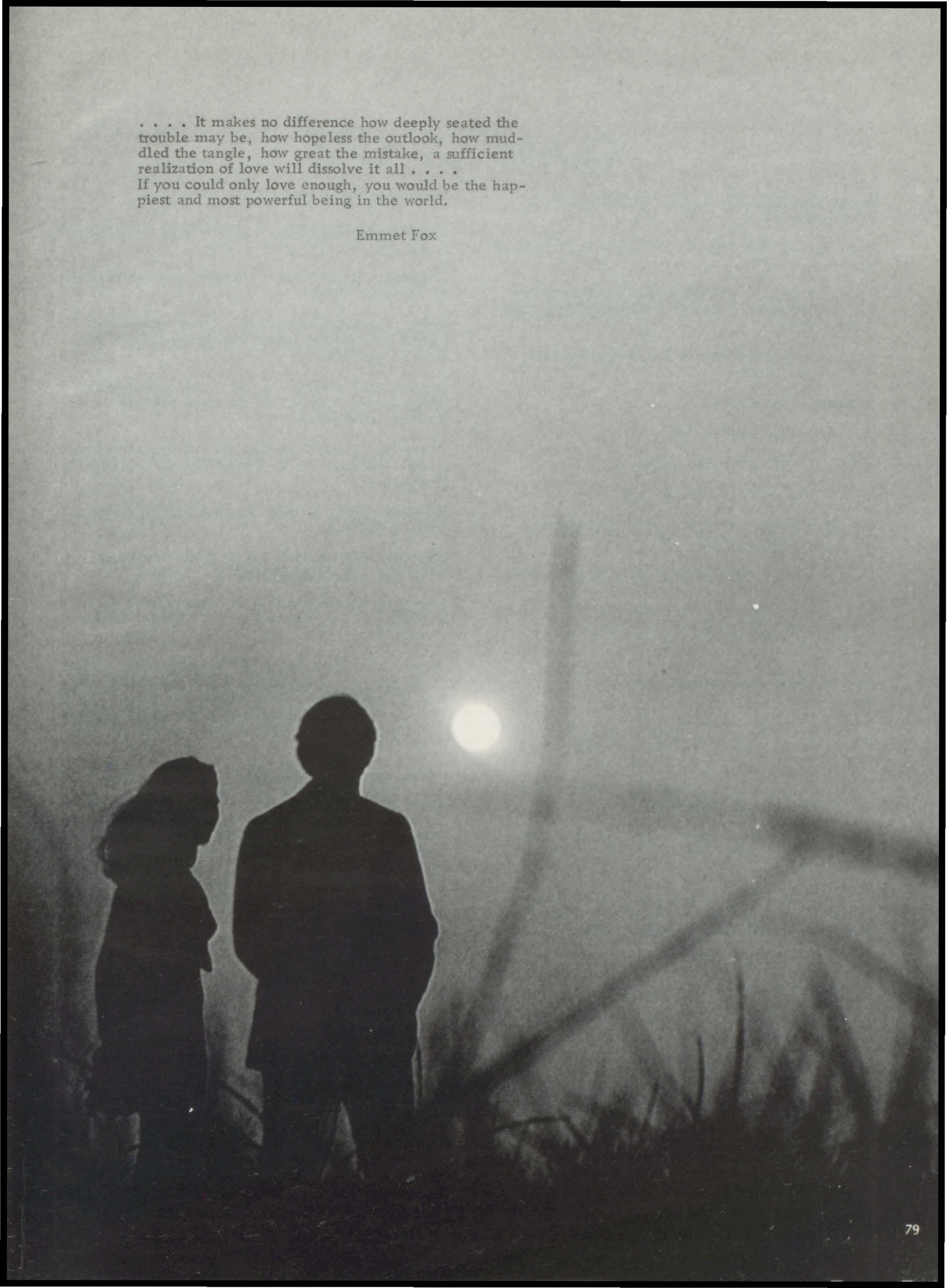•••• It makes no difference how deeply seated the trouble may be, how hopeless the outlook, how muddled the tangle, how great the mistake, a sufficient realization of love will dissolve it all